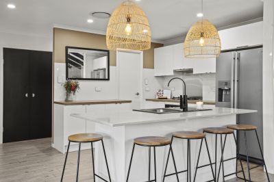 Distinguished by high vaulted ceilings and exposed beams throughout the modern kitchen, dining and living all flowing beautifully to the rear alfresco dining area and large grassy yard. The layout of this home provides seamless interaction between the indoor and outdoor spaces.