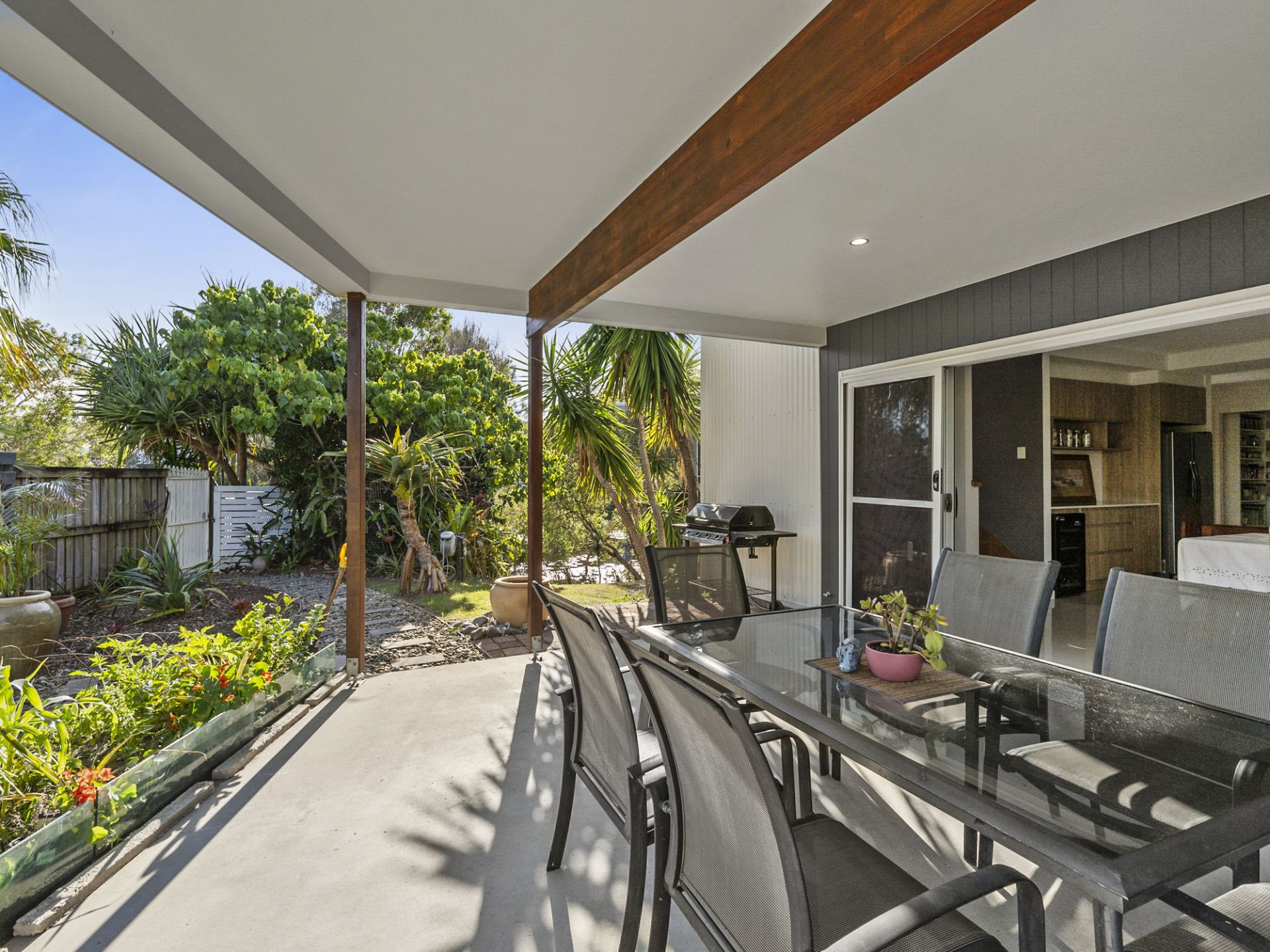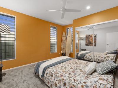 The seamless flow between indoor and outdoor living is epitomised by sliding doors that open onto a spacious alfresco dining and BBQ area. Here, you'll overlook an established landscaped, green yard with direct access to Cudgen Creek-a perfect setting for family gatherings or quiet afternoons by the water.