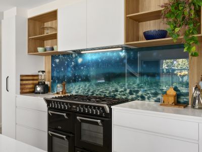 Upon entry, the open-plan living area welcomes you with warmth and elegance. The kitchen, a true heart of the home, is designed for both style and functionality, featuring wood-grain joinery, a freestanding oven with a gas cooktop, and textural details that add a refined touch. Entertaining is a breeze, with an oversized island bench, a dedicated bar, and a well-appointed butler's pantry to meet all your culinary needs.