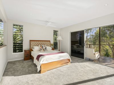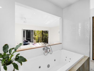 The bedroom spaces are equally thoughtful in design, all equipped with built-in robes, blending practicality with understated elegance. The master suite stands as a private sanctuary, complete with a stunning ensuite and soaking tub, which extends onto a private balcony offering dappled sunlight and views of the creek framed by Melaleuca trees-a peaceful spot for your morning coffee.