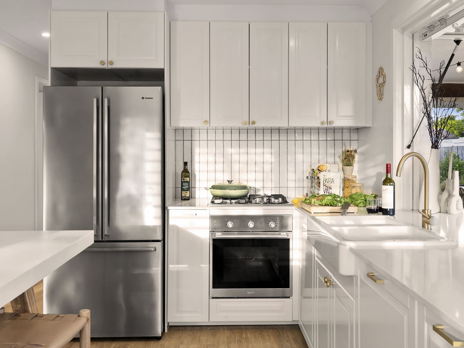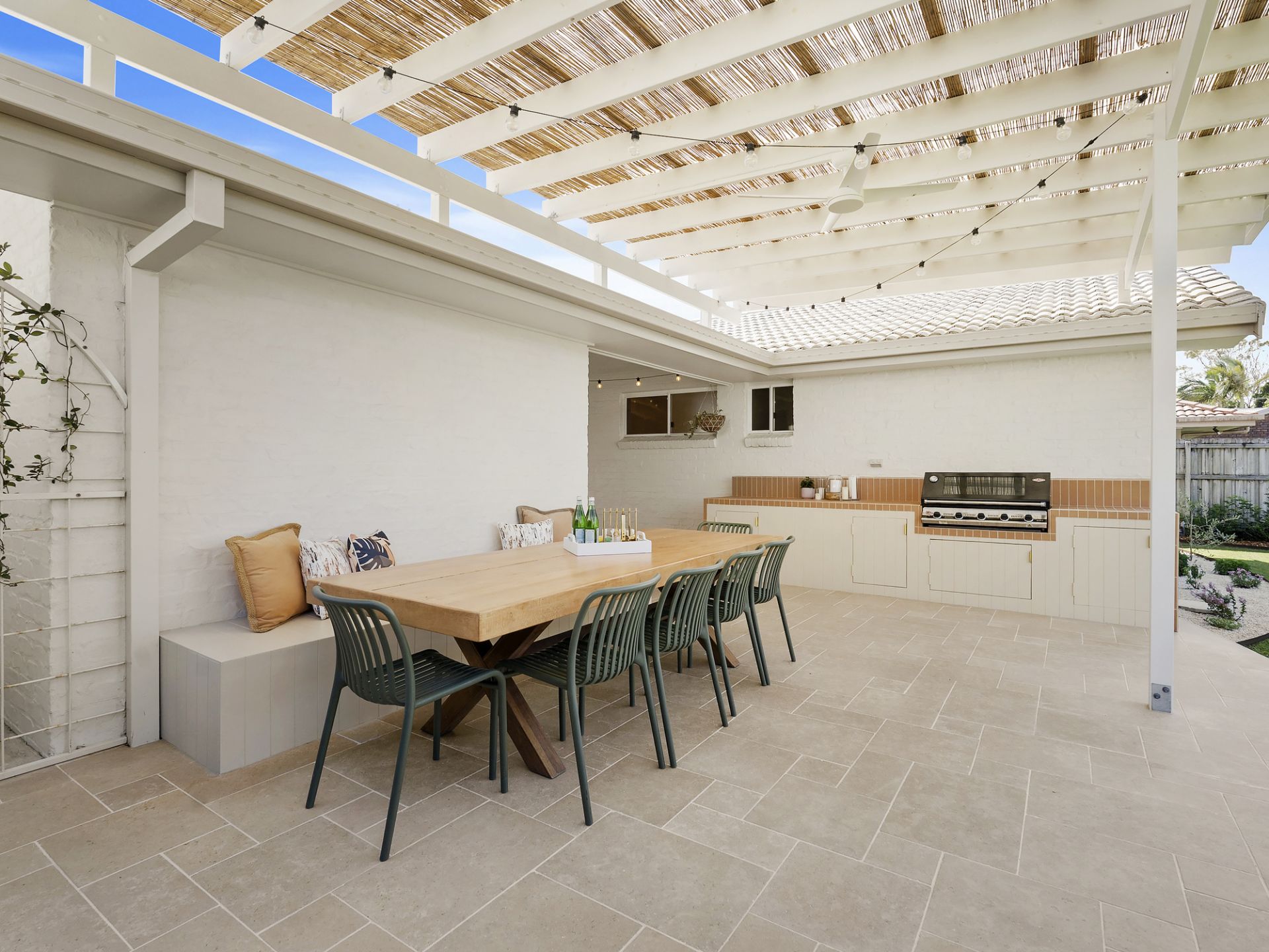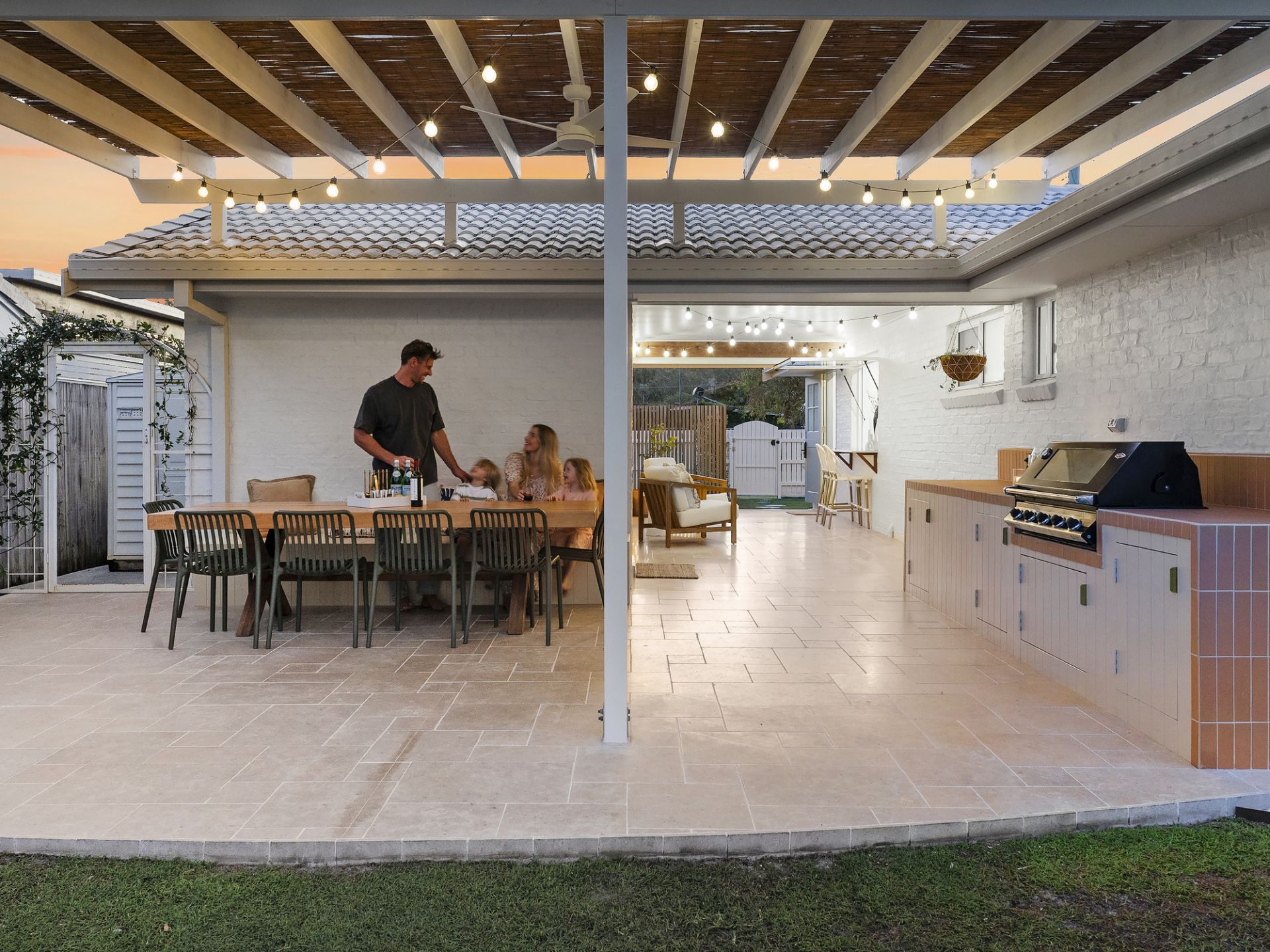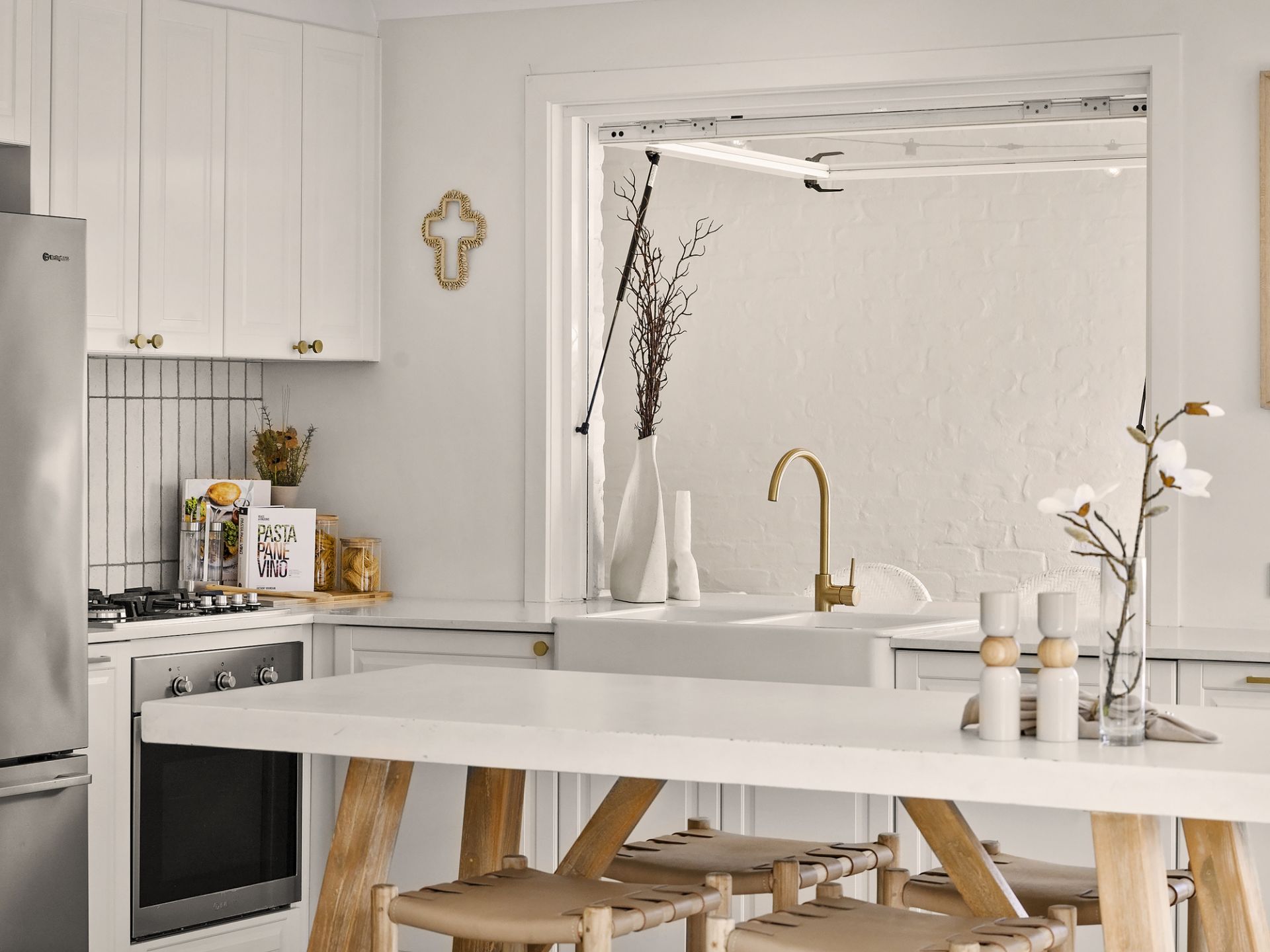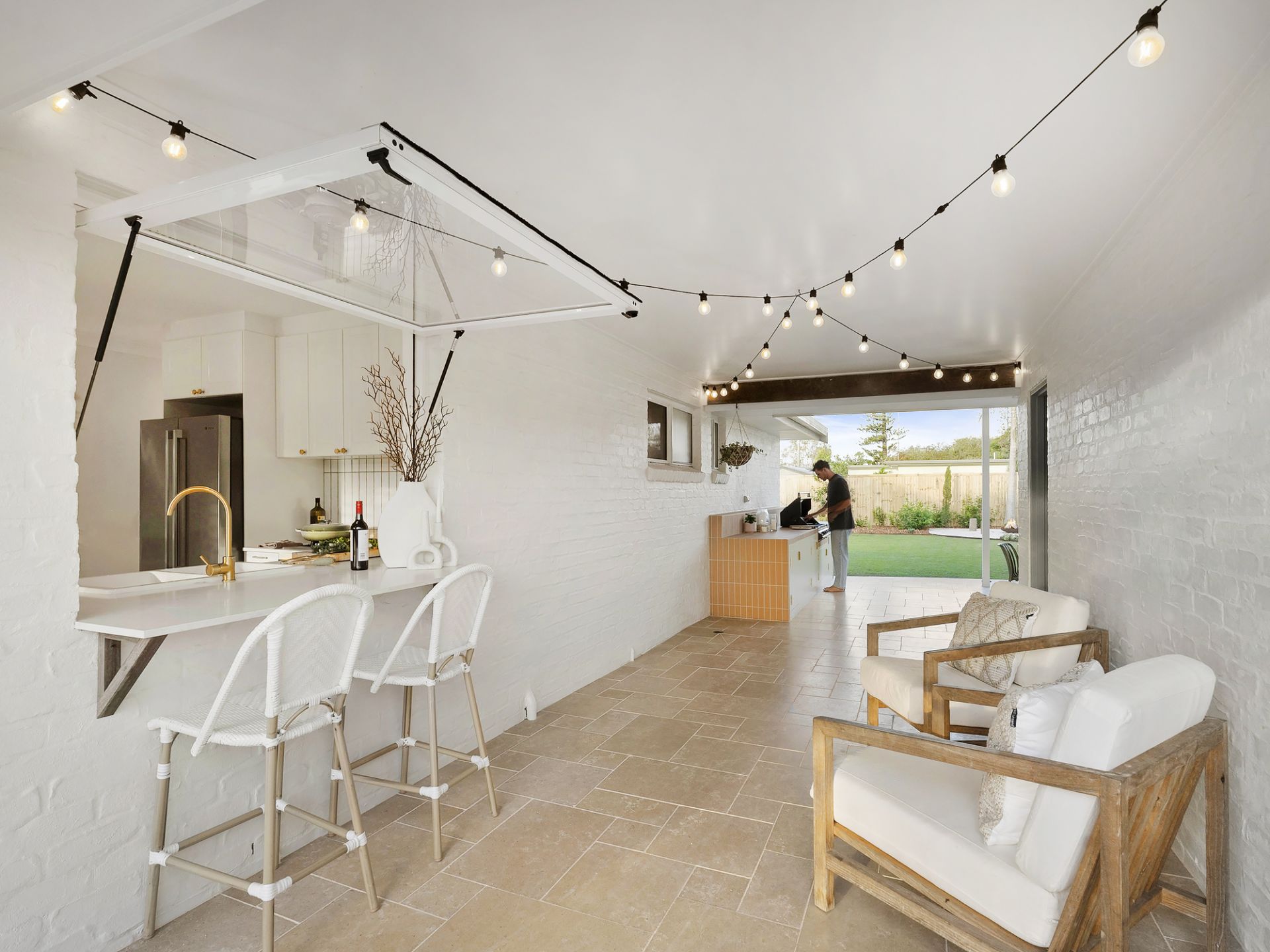 Inside, the heart of the home is a sunlit open-plan kitchen and living area. French doors and a clever gas-strut servery window create seamless indoor-outdoor flow to the alfresco dining space, the ultimate entertaining zone. Finished with luxurious limestone pavers, this inviting area features a built-in BBQ with eye-catching terracotta tiles and a custom bench seat - perfect for long lunches and sunset dinners with loved ones.