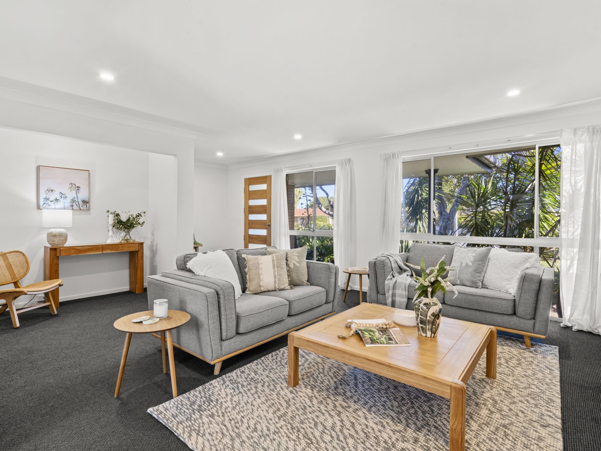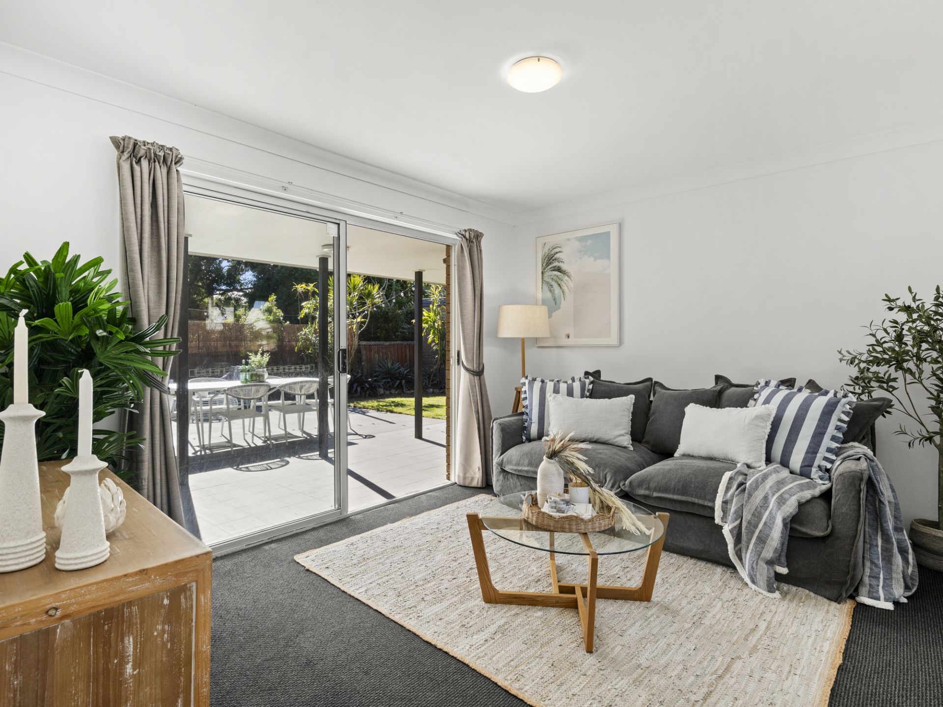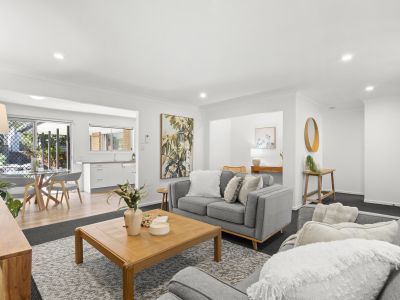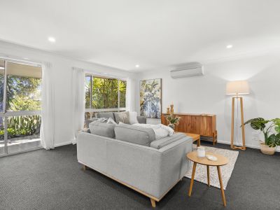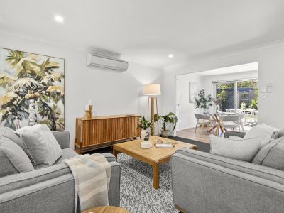 Brimming with natural light and relaxed coastal charm, the current three-bedroom residence offers flexible family living across a thoughtful single-level layout. At the front of the home, a spacious living area with large windows welcomes in the sunshine and sea breeze, while an adjoining study nook offers a quiet space for work, reading, or reflection.