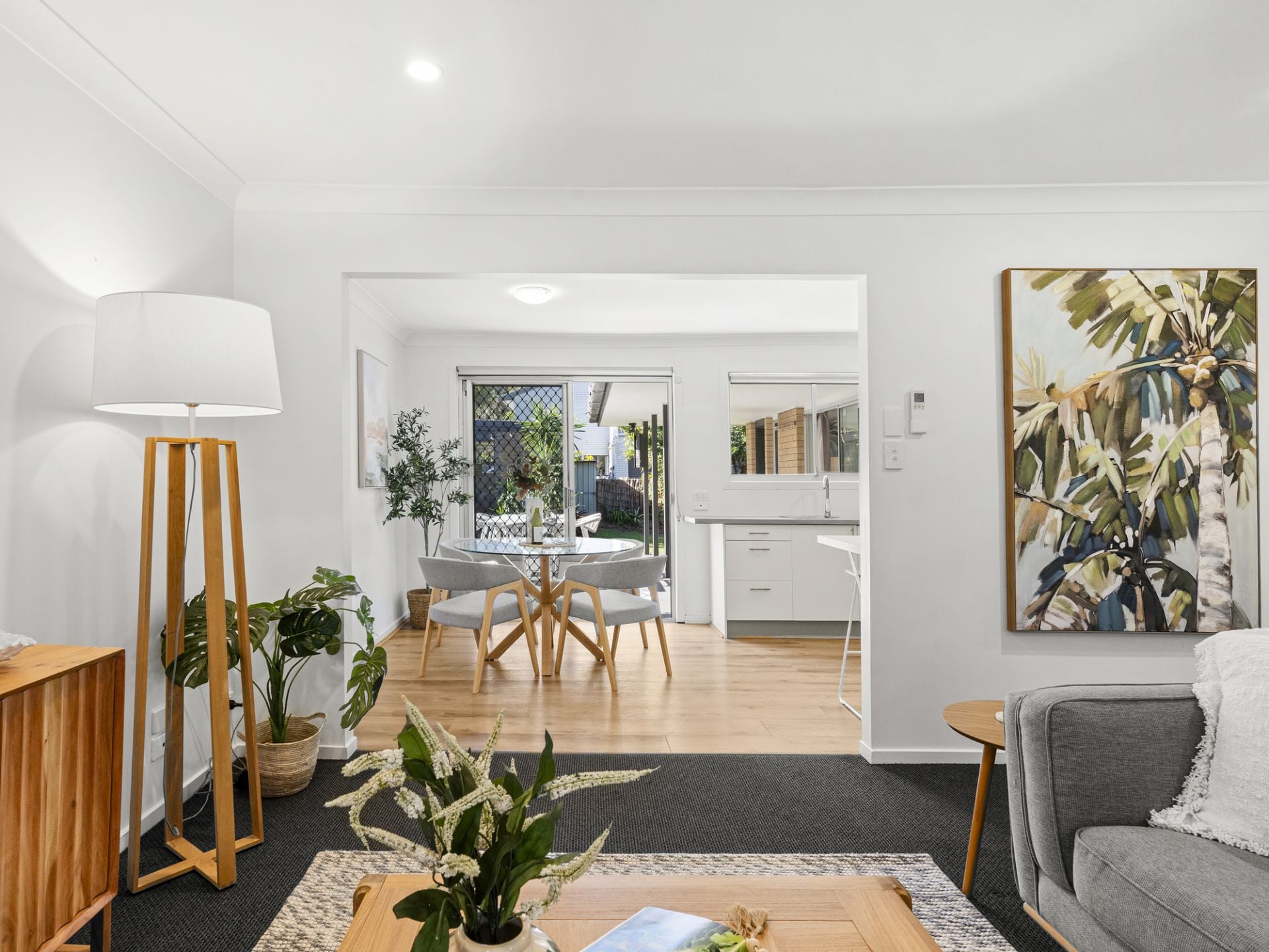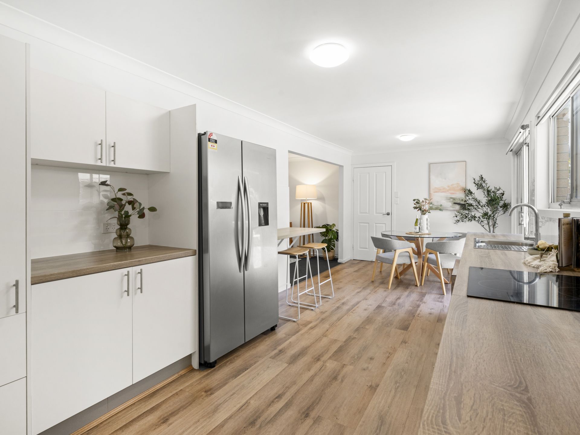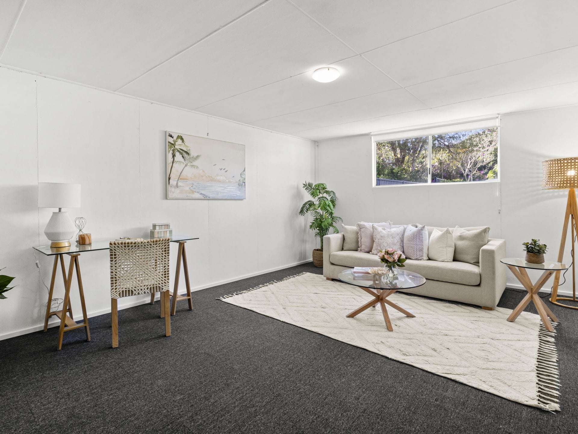 Brimming with natural light and relaxed coastal charm, the current three-bedroom residence offers flexible family living across a thoughtful single-level layout. At the front of the home, a spacious living area with large windows welcomes in the sunshine and sea breeze, while an adjoining study nook offers a quiet space for work, reading, or reflection.