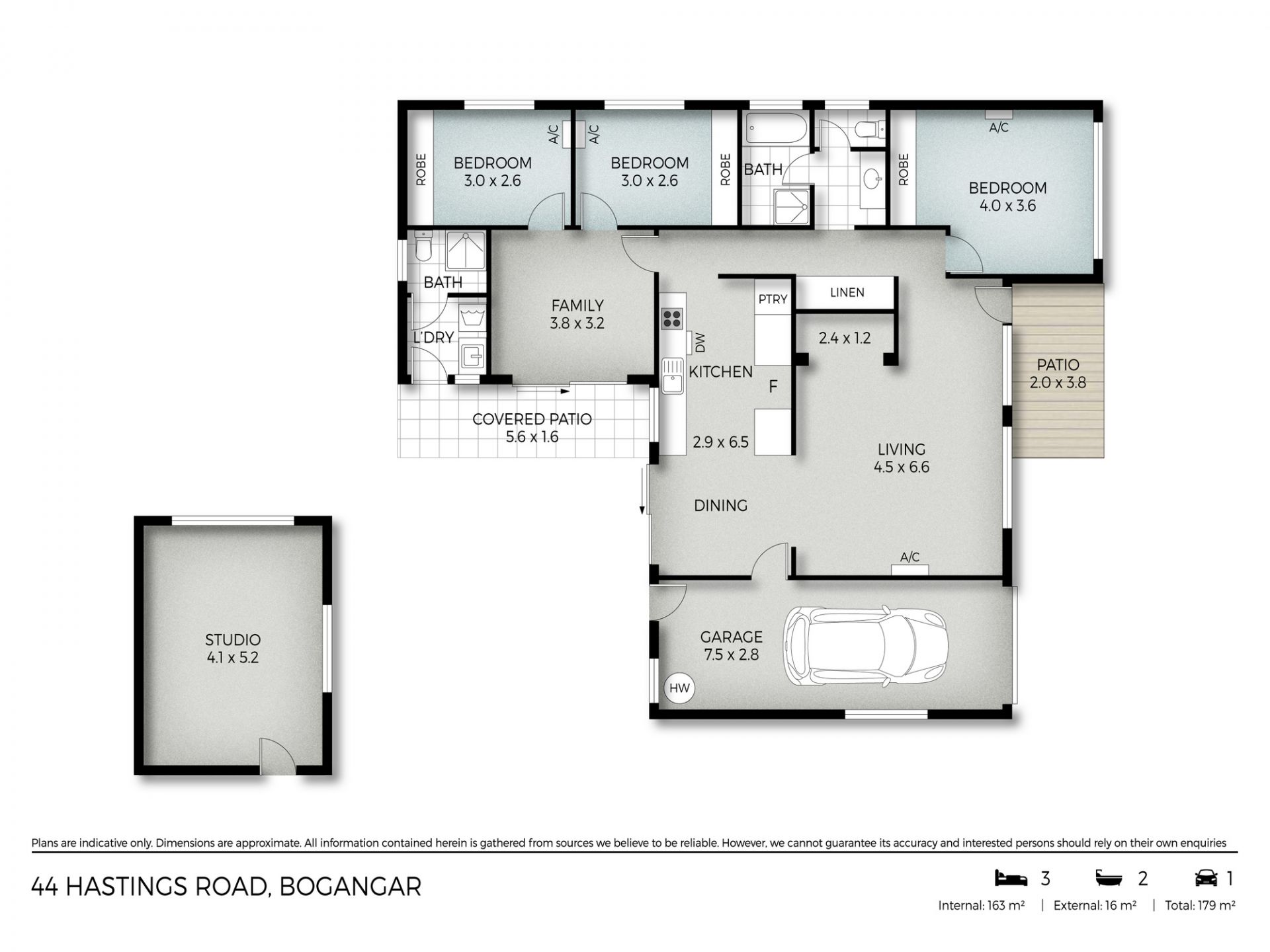 - Two bathrooms (one external/laundry combo)