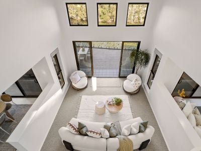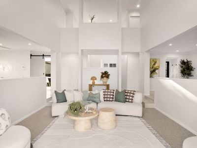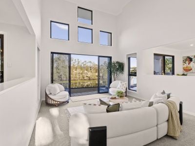 On arrival, the established tropical front garden offers a tranquil welcome, giving you a glimpse of what's to come and beckoning you towards the front door. Once inside, the entry hallway opens up to the central, sunken living room. The space is bathed in natural light courtesy of its striking double-height ceiling, soaring windows and expansive glass sliding doors, which perfectly frame the water beyond. It's a beautifully inviting area offering a comfortable zone to relax, gather or catch up with friends.