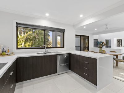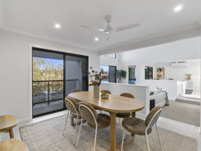 The modern kitchen and dining area is thoughtfully tucked to one side of the central living space, subtly divided by a nib wall and featuring a bank of windows that bring in leafy views with coastal breezes. The kitchen itself is generously appointed, with ample bench space, abundant storage, and modern appliances, while the dining area offers plenty of room for family meals and is perfectly suited to both everyday living and entertaining alike.
