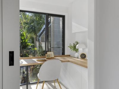 For those needing a work-from-home zone, the study offers a calming and inspiring space you'll actually look forward to working in. Here, a built-in timber desk sits in front of a large picture window, flooding the space with natural light and framing the lush garden outlook, while louvred glass panels on each side bring in the fresh ocean breezes.