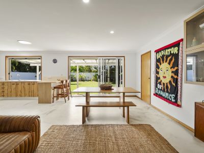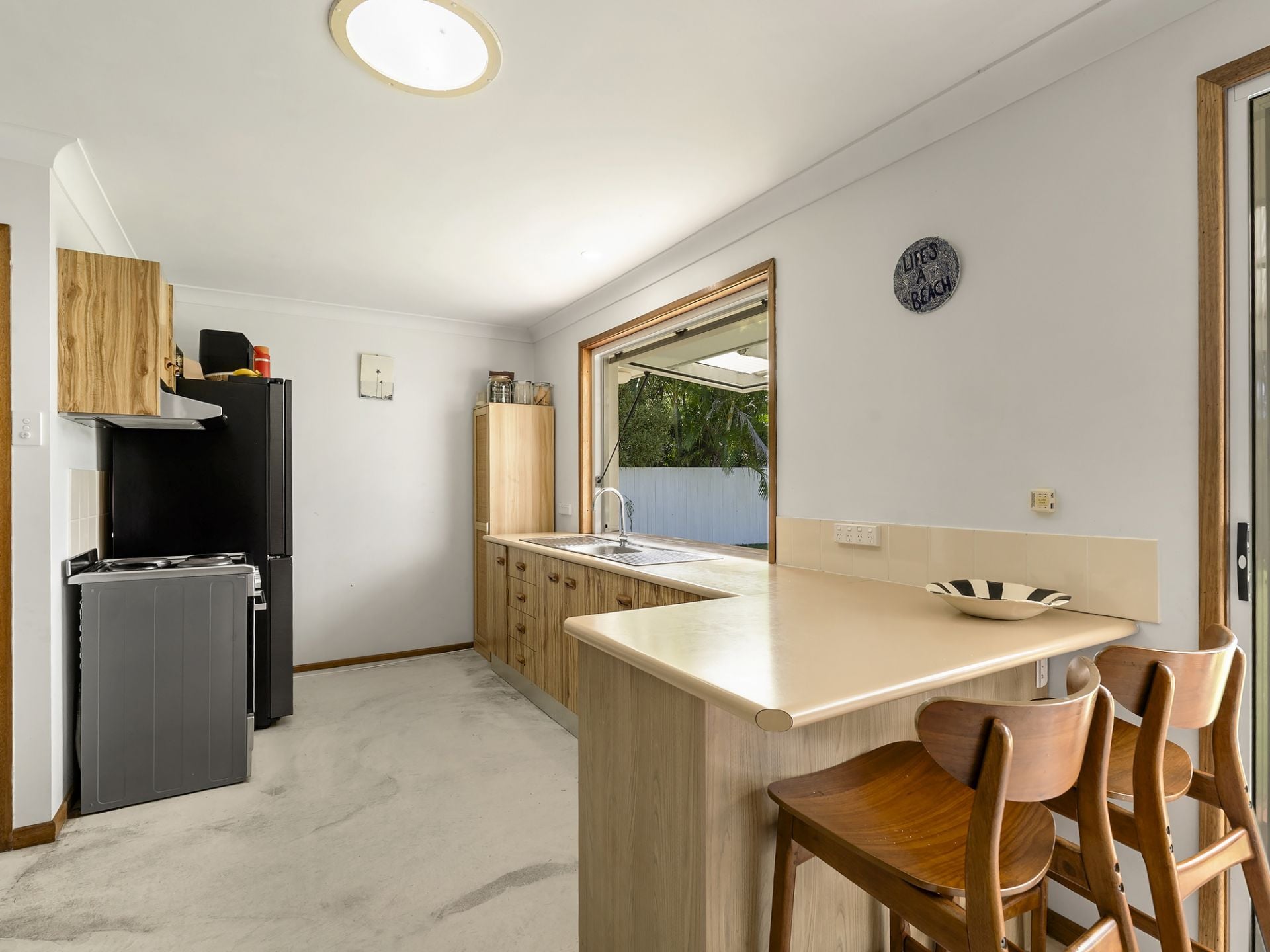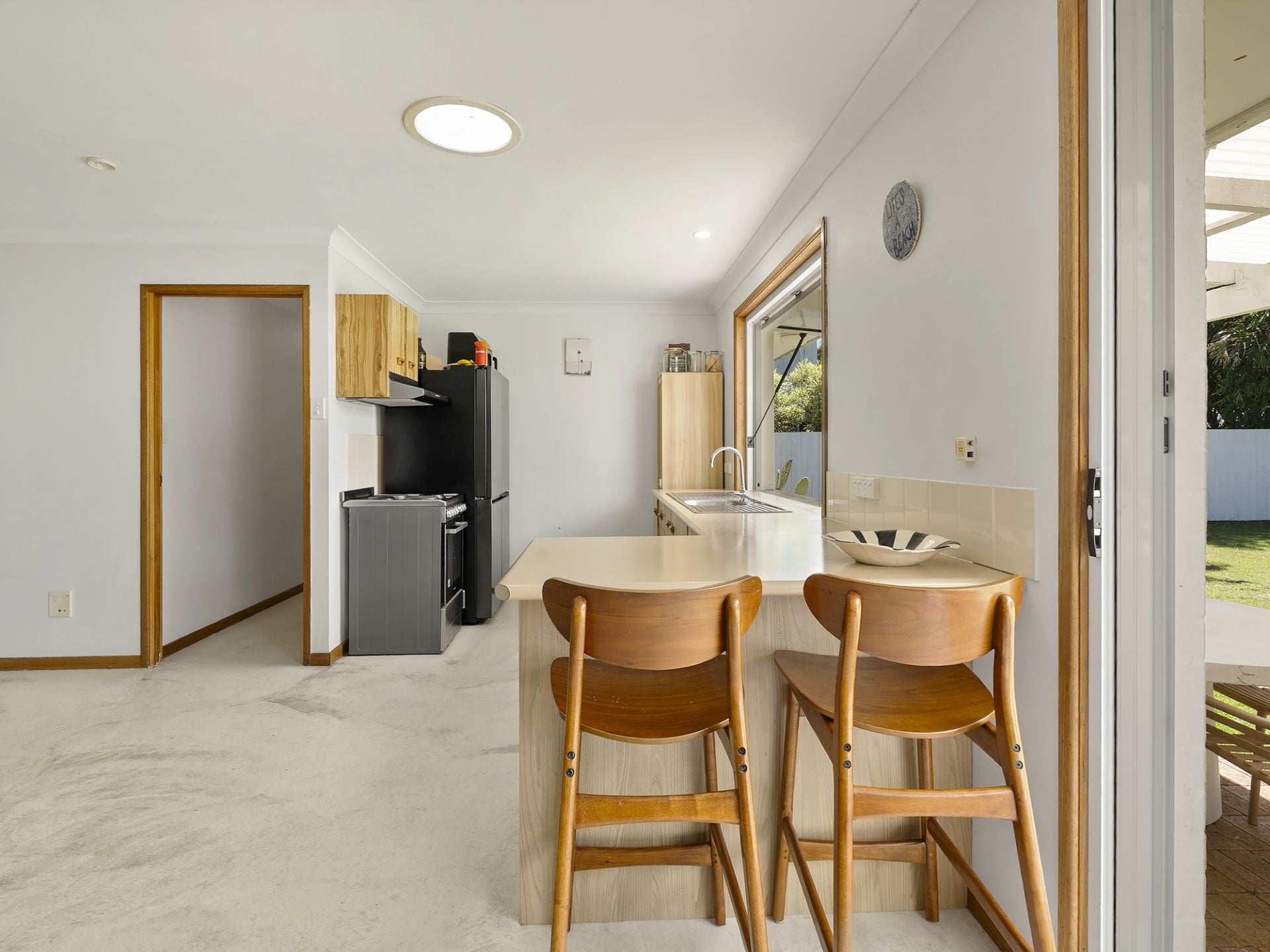 The northern wing hosts three bedrooms and a central bathroom, while the southern side offers a single garage with adjoining laundry. Original in its bones, with exposed concrete floors and a neat, well-kept kitchen and bathroom, it's immediately comfortable with clear scope to evolve over time.