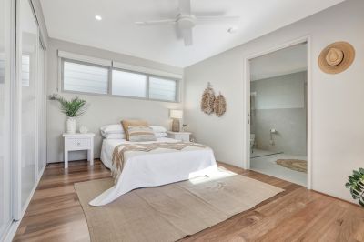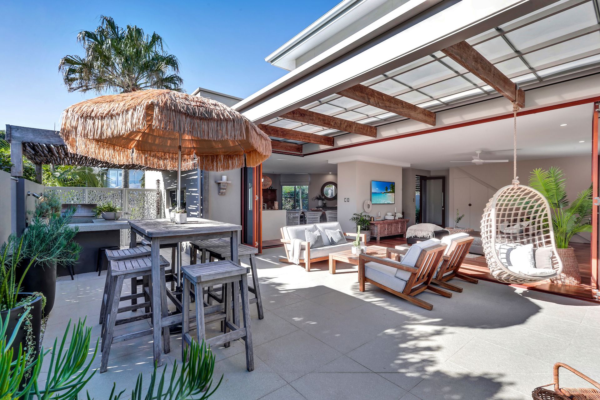 The house maintains its holiday allure with five spacious bedrooms and four and a half bathrooms. A private haven is promised in the master bedroom, featuring an ensuite, walk-in robe, and direct access to the pool and alfresco zone. On the upper level, two wings offer valuable versatility: one could flex as a junior suite with bathroom or additional living room, and the other as a private, self-contained one-bedroom/bathroom studio apartment, complete with a kitchenette, separate entrance, and views of Mount Warning.