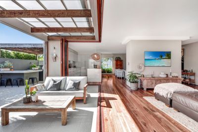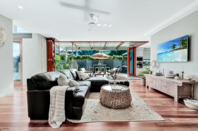 Stepping inside is like turning on vacation mode. The home's design prioritises spacious and light-filled living areas, while the gourmet kitchen boasts premium German appliances. High ceilings and polished timber floors create warmth, while expansive glasswork and handcrafted New Guinea Rosewood doors blur the lines between the indoors and the lush outdoors.