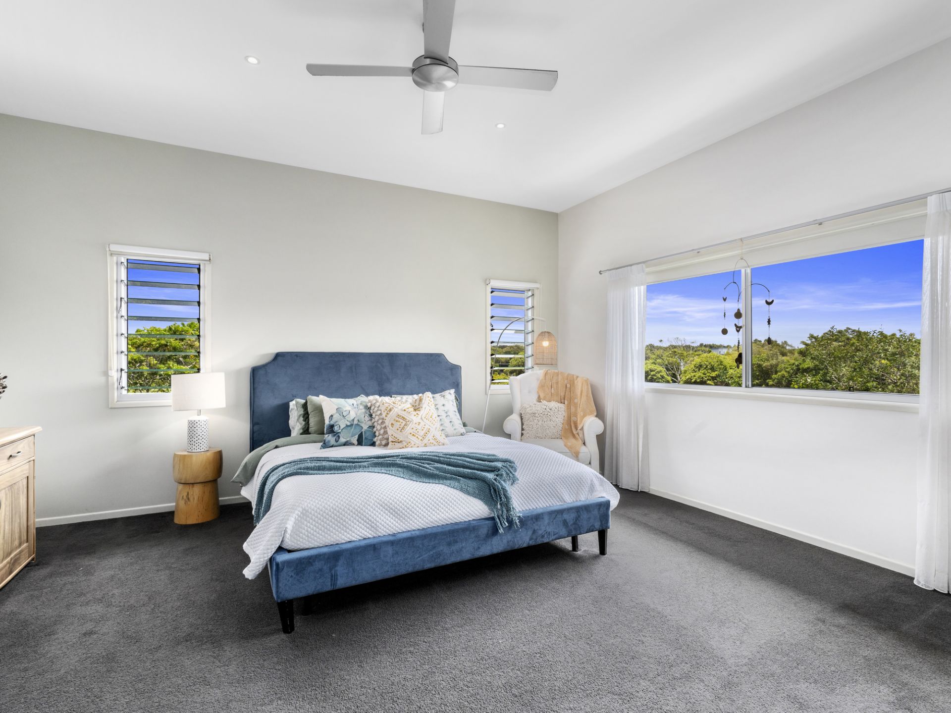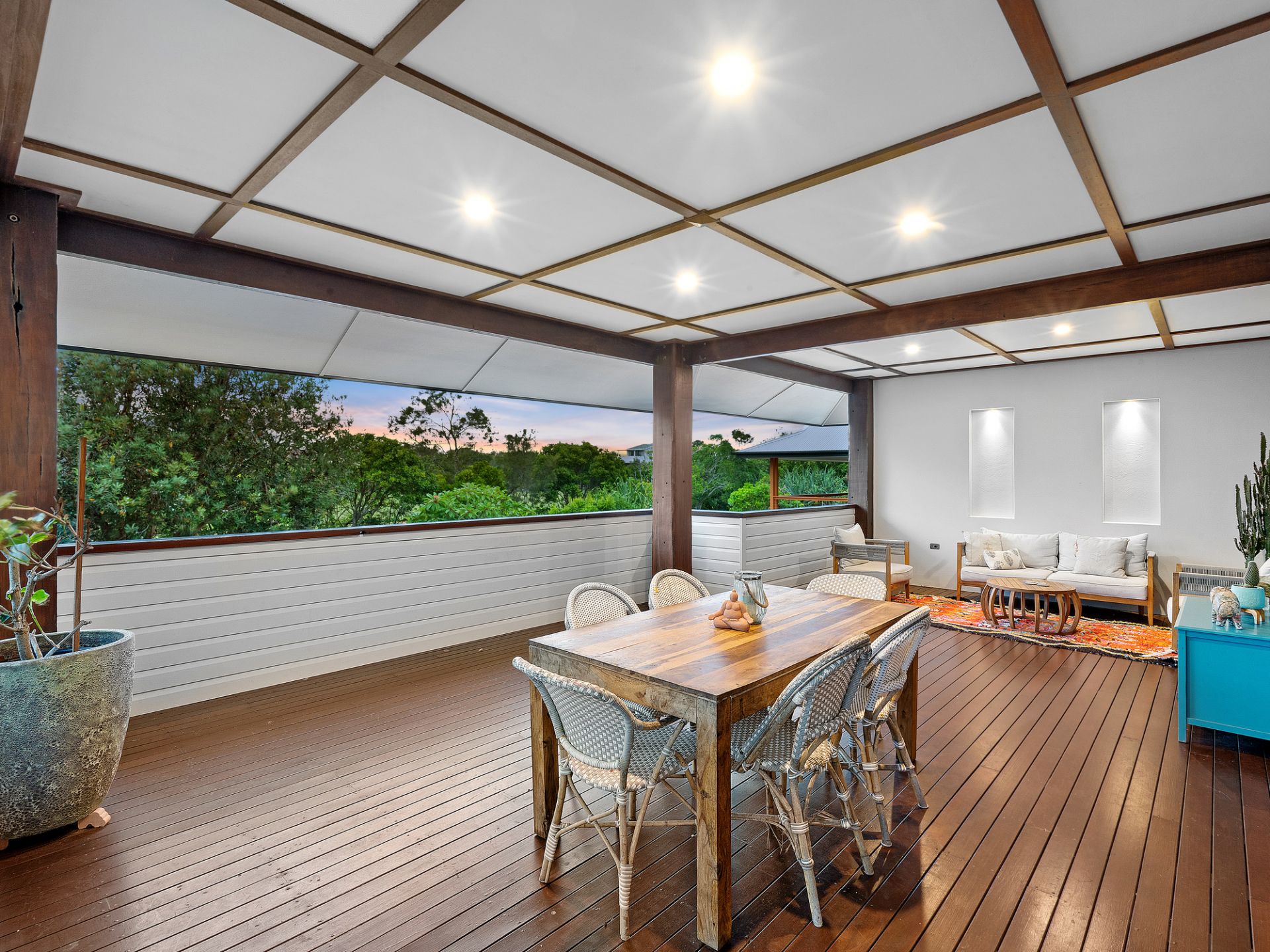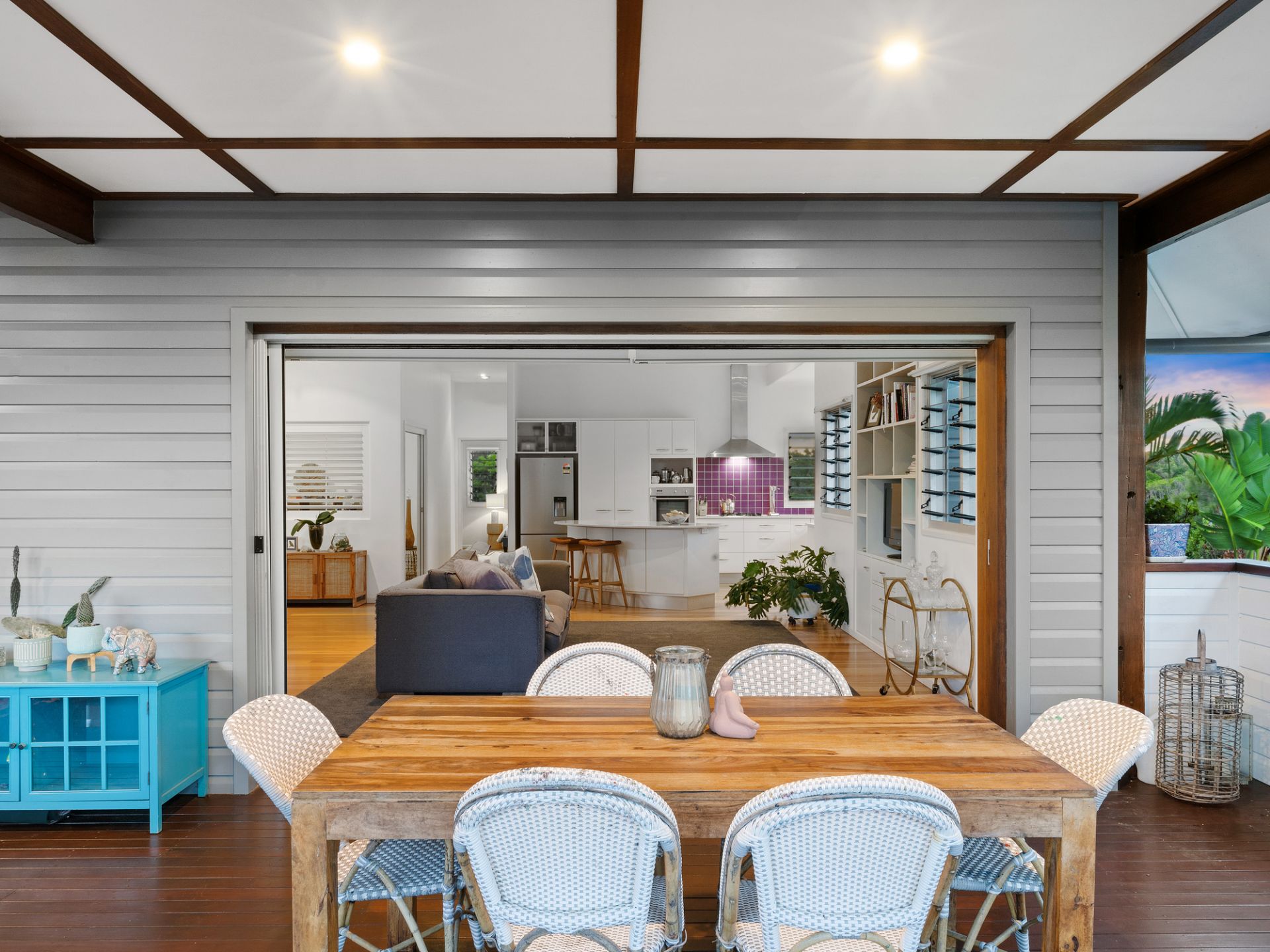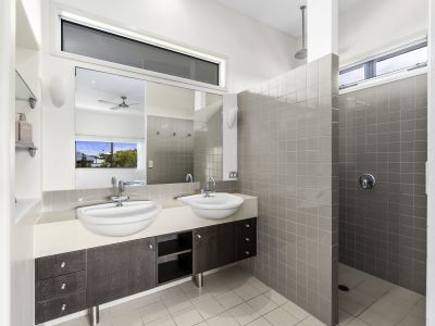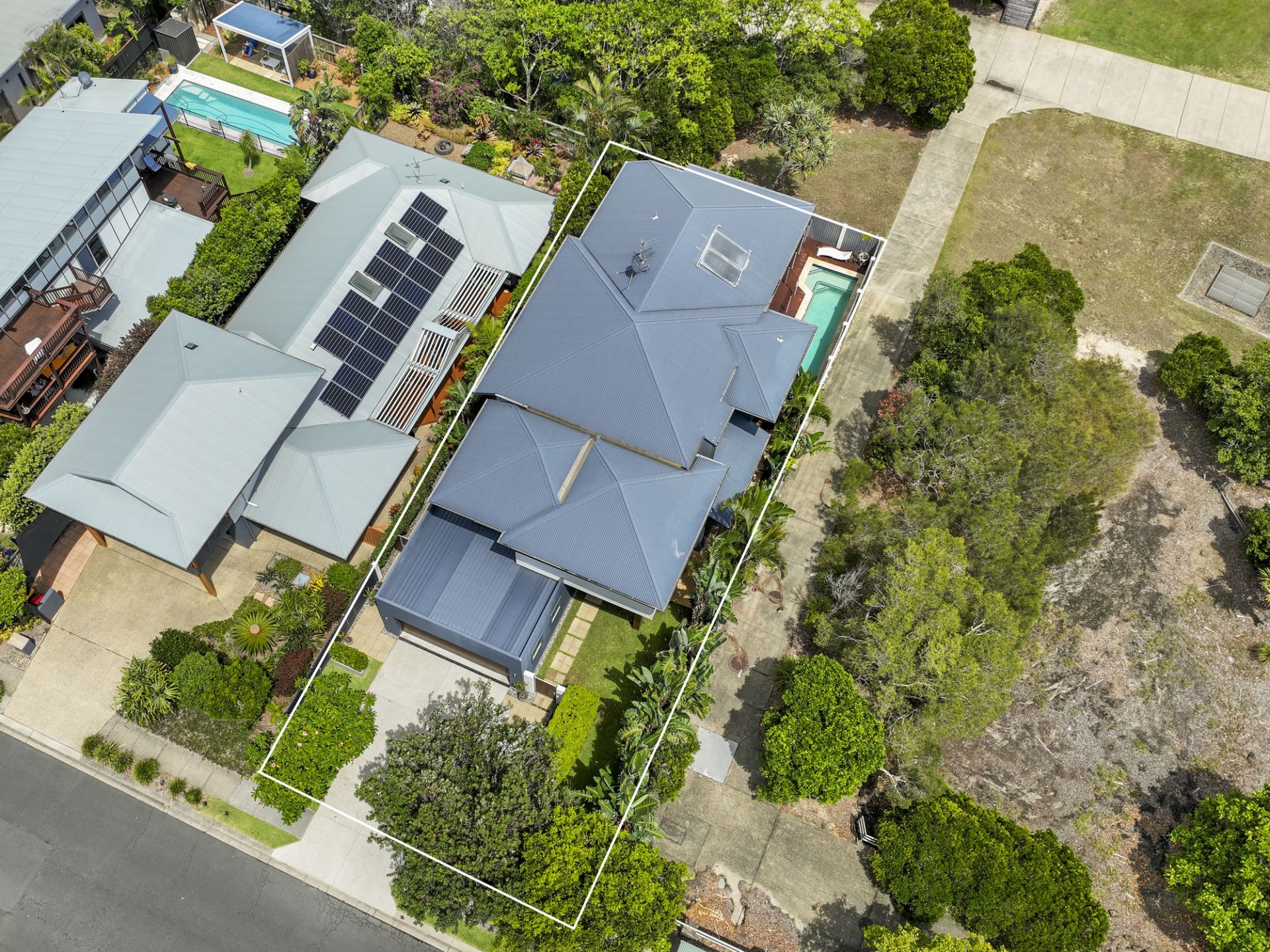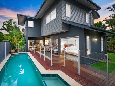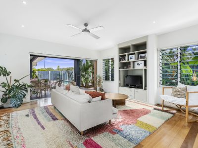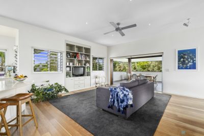 Tucked away on a northeast corner block and specifically chosen with only one neighbouring property to the south, the home curates a tropical oasis atmosphere from the moment you step beyond the private front fencing into a haven of lush green gardens.