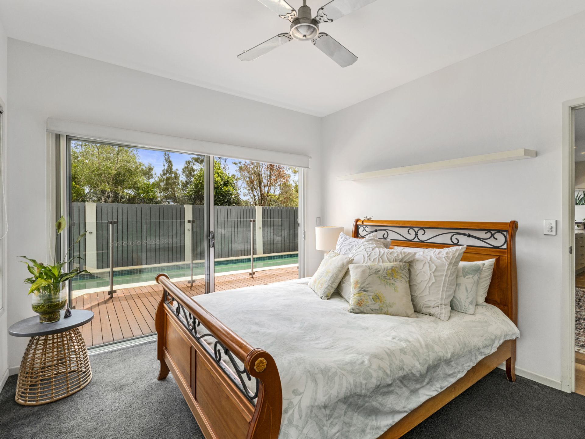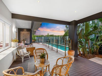 Here you'll find a stunning lap-style plunge pool bathed in northern sunlight, a deck that runs right to the rear of the property, and a serving bar with bifold windows accessing the wet bar within. Three full-sized bedrooms complete the downstairs offerings, each with built-in robes and ceiling fans, adjoining a main bathroom, and a family-sized laundry room with access to the rear grassy yard.