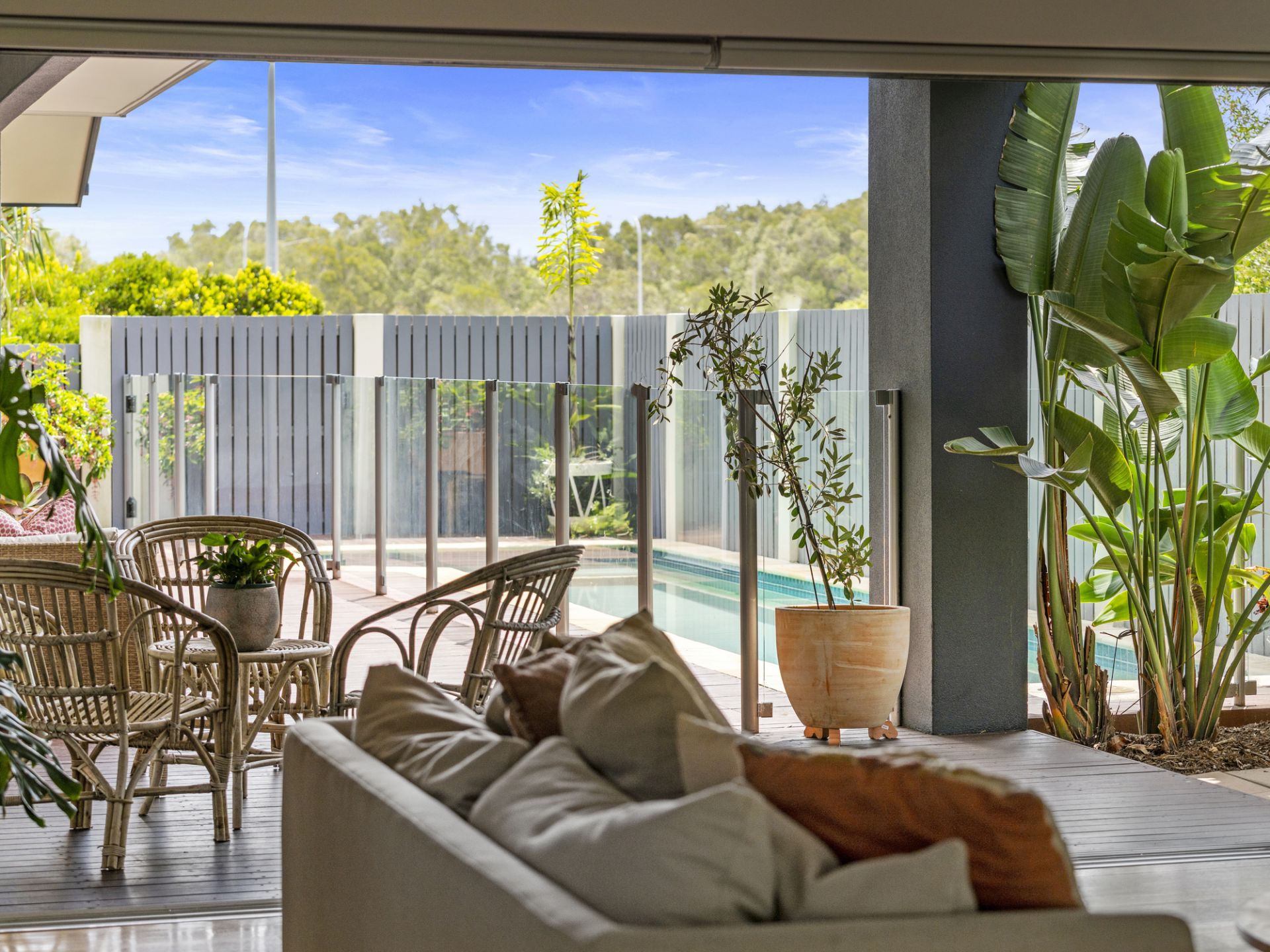 Stacker sliding doors to outdoor deck and lap-style plunge pool