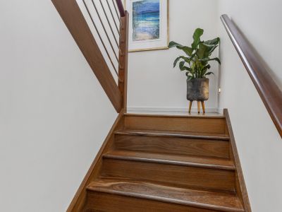 Entering via the ground floor, a covered front patio leads into the spacious family room, outfitted with beautiful hardwood timber floorboards, abundant natural light from louvred windows, and easy access to the rear outdoor patio via stacker sliding doors.
