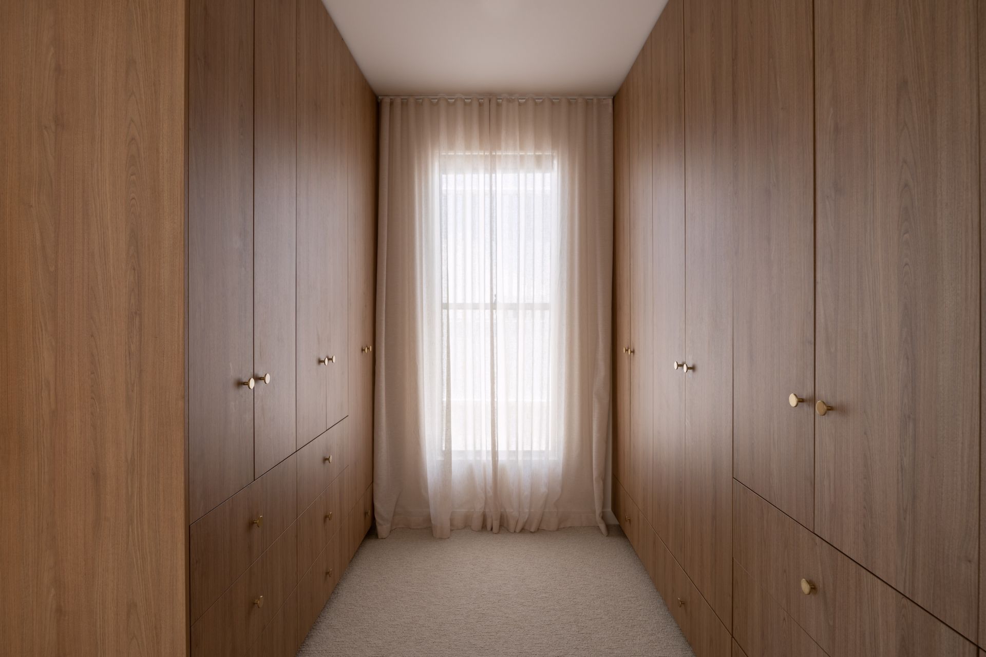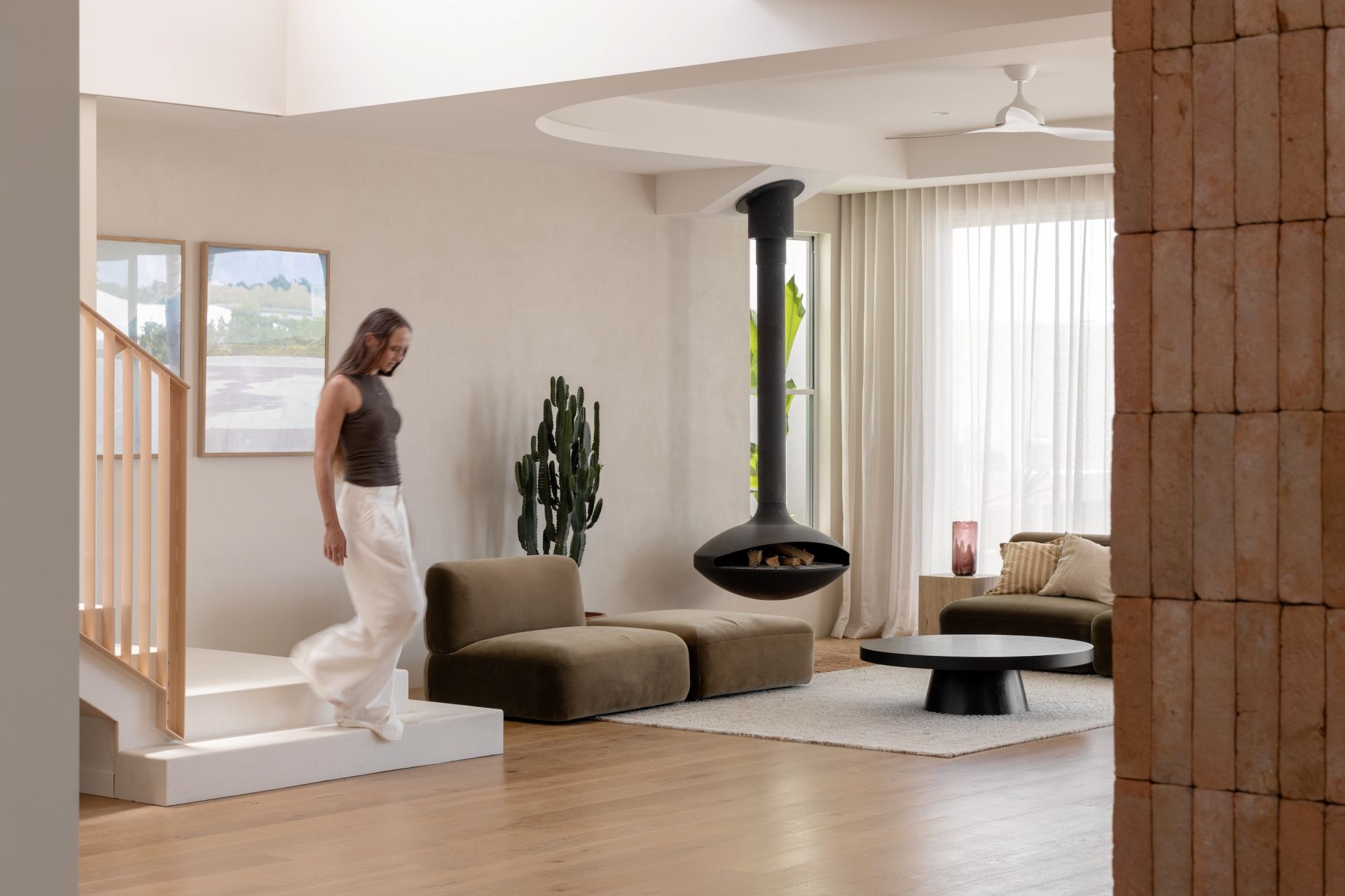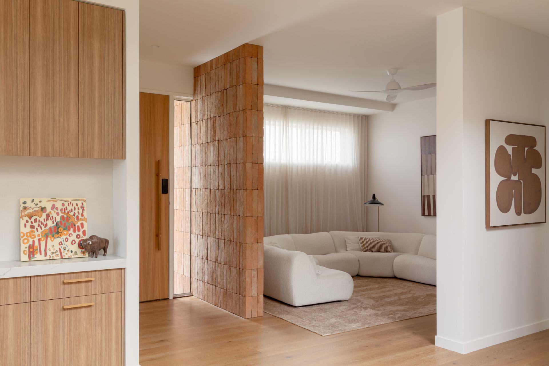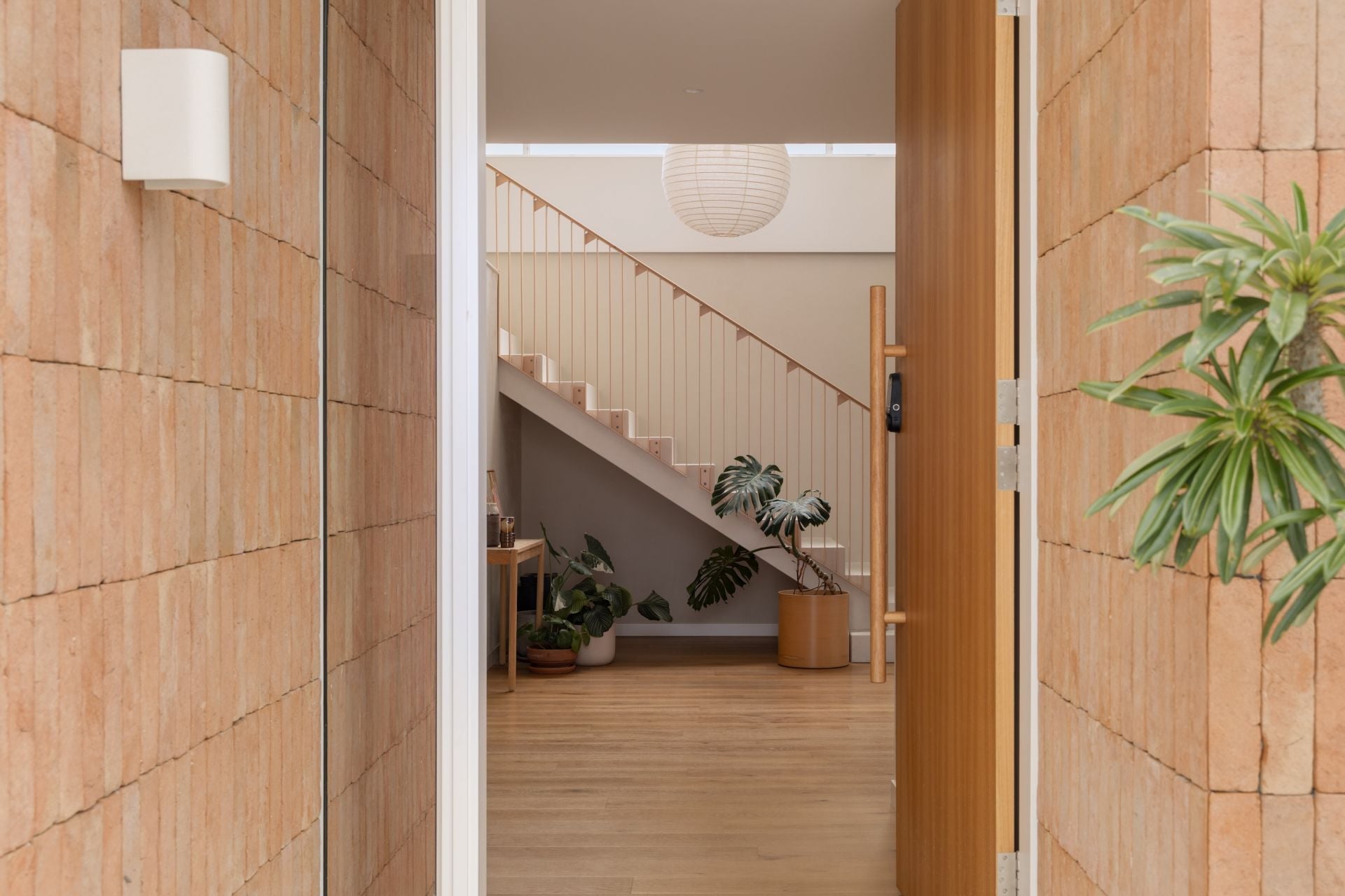 A custom timber front door opens into an intimate threshold before the home expands upward and outward. American Oak floors extend from the entry, their natural warmth and grain grounding the interior and softening the transition from outside to in. A wide staircase draws light deep into the home, creating a gentle interplay of light and shadow throughout the day.