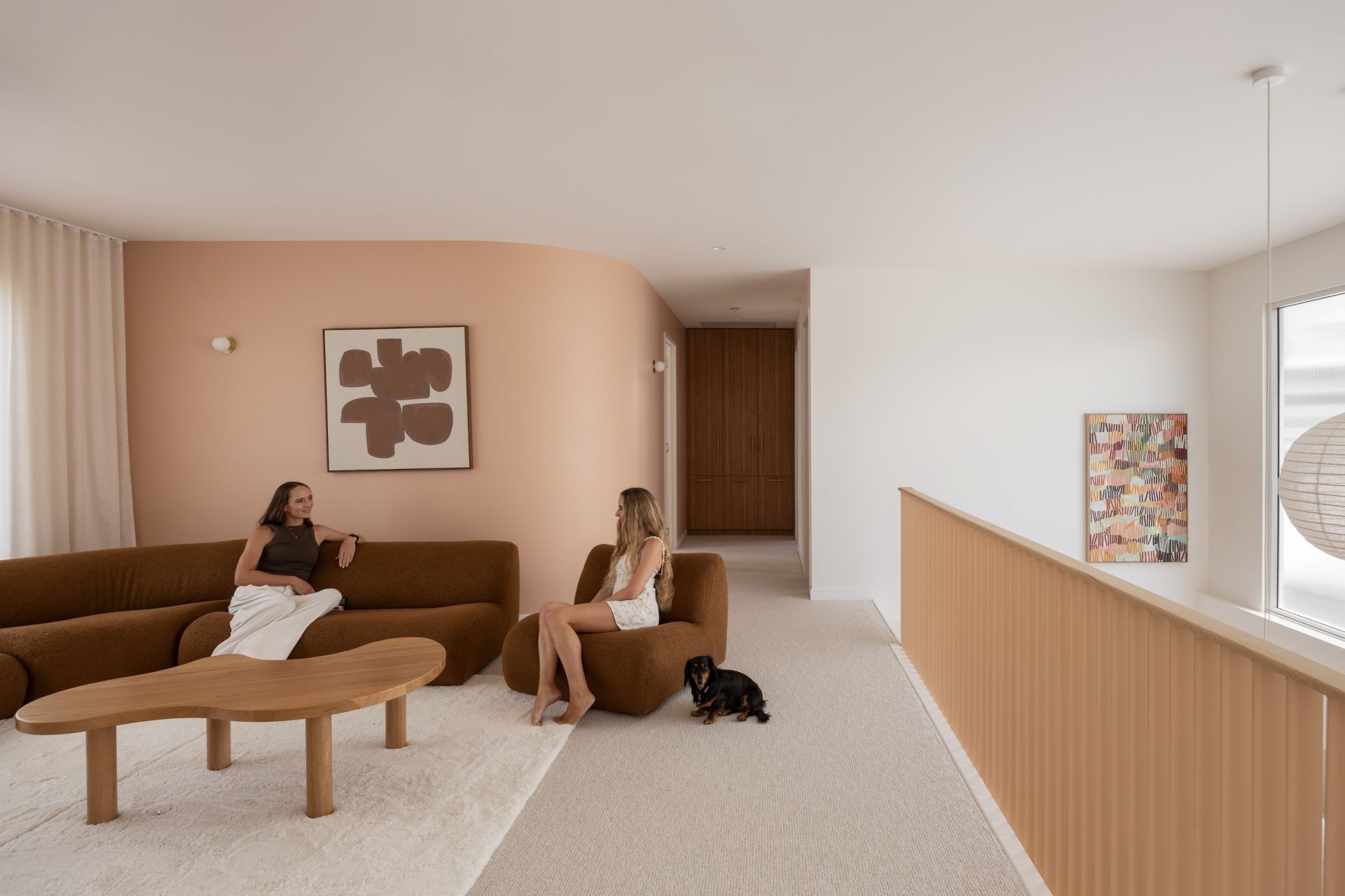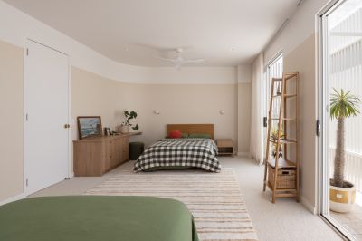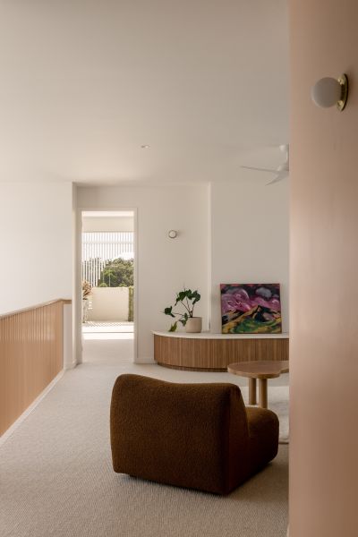 Upstairs, a third living space provides a relaxed family retreat. Three generous bedrooms feature custom joinery and thoughtful storage. Originally designed and approved as a four-bedroom home, two rooms were combined to create an expansive children's zone - a decision that can easily be reversed to restore the original layout if desired.