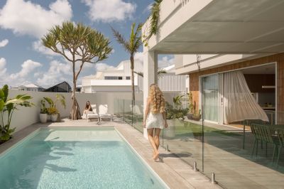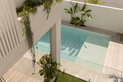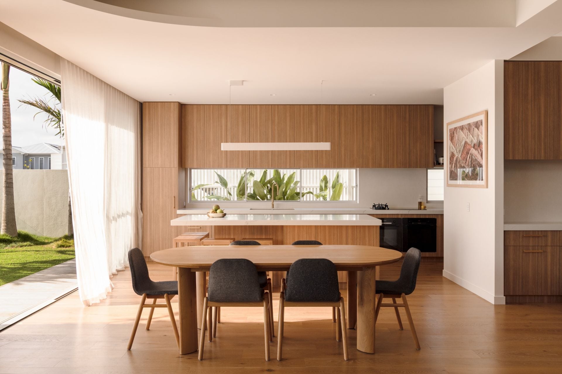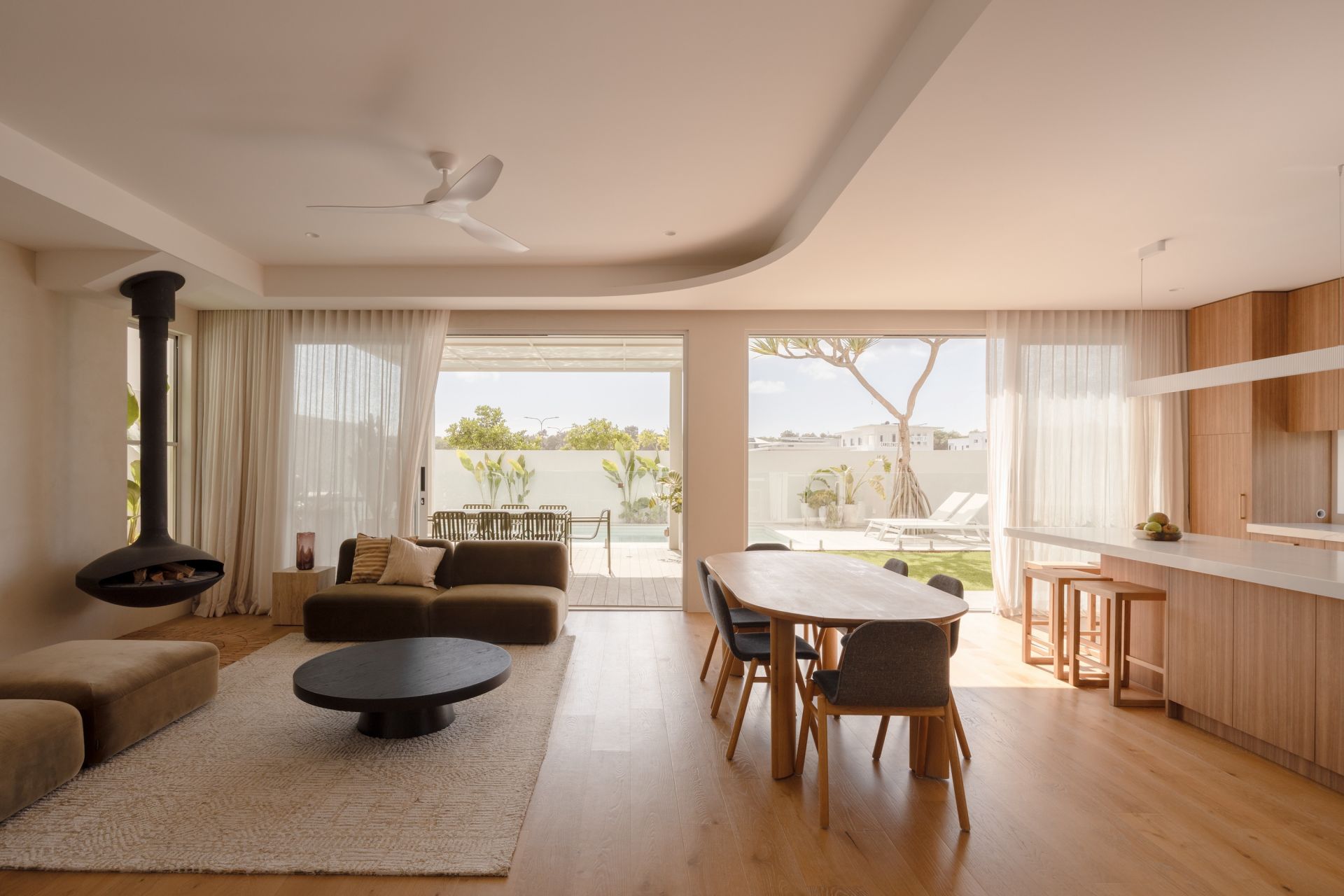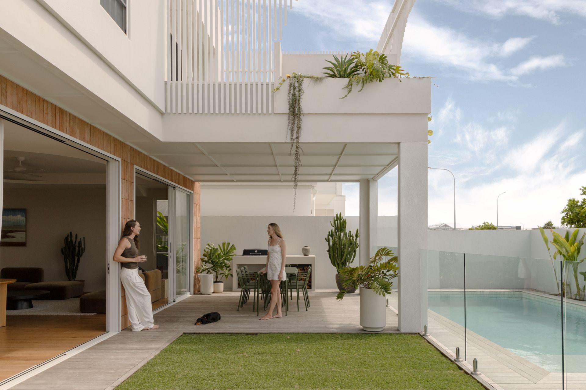 Large sliding doors connect seamlessly to a sunlit front courtyard and pool - a confident and highly effective response to the corner position. Private and protected, the space reads as a secluded garden rather than a frontage. Anchored by a mature pandanus and carefully framed from the street, it incorporates a covered alfresco zone with built-in barbecue, designed for long afternoons, entertaining and effortless outdoor living.