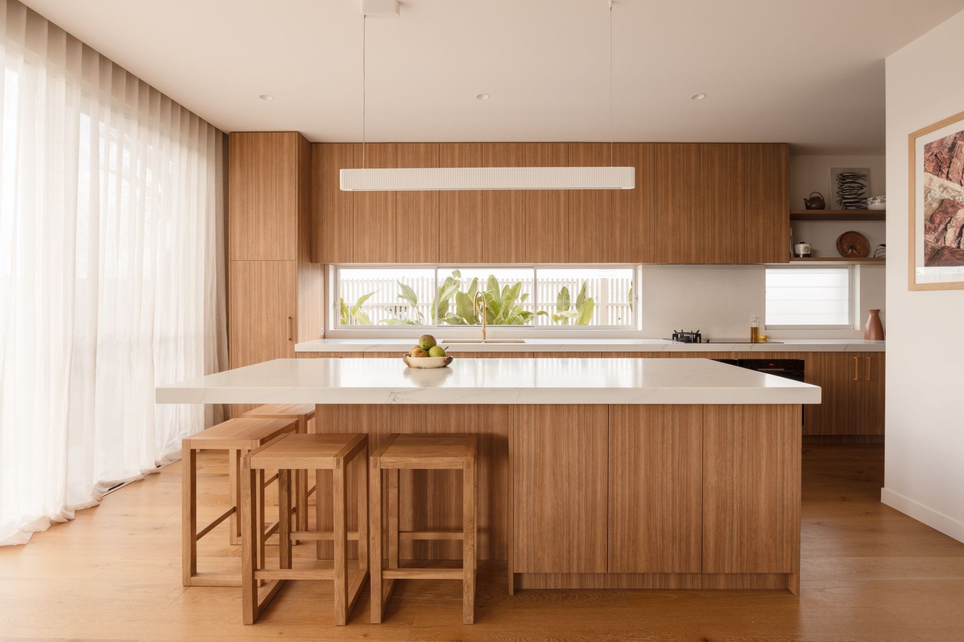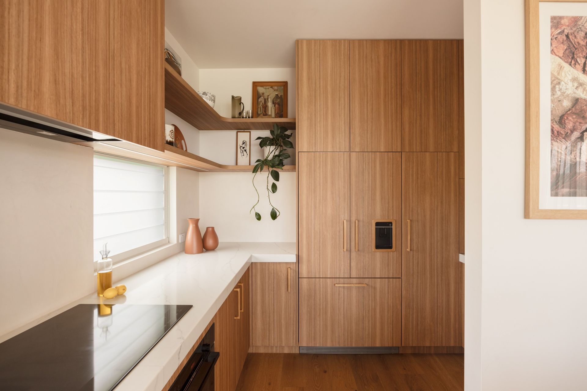 – Custom kitchen joinery with integrated fridge