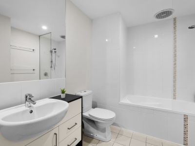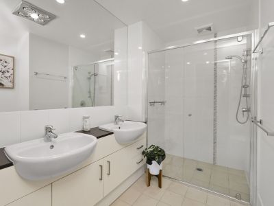 On the lower level, the light-filled master bedroom shares access to the oversized balcony and comes complete with a walk-through robe and ensuite. A generously sized second bedroom, main bathroom, and separate laundry complete the apartment.