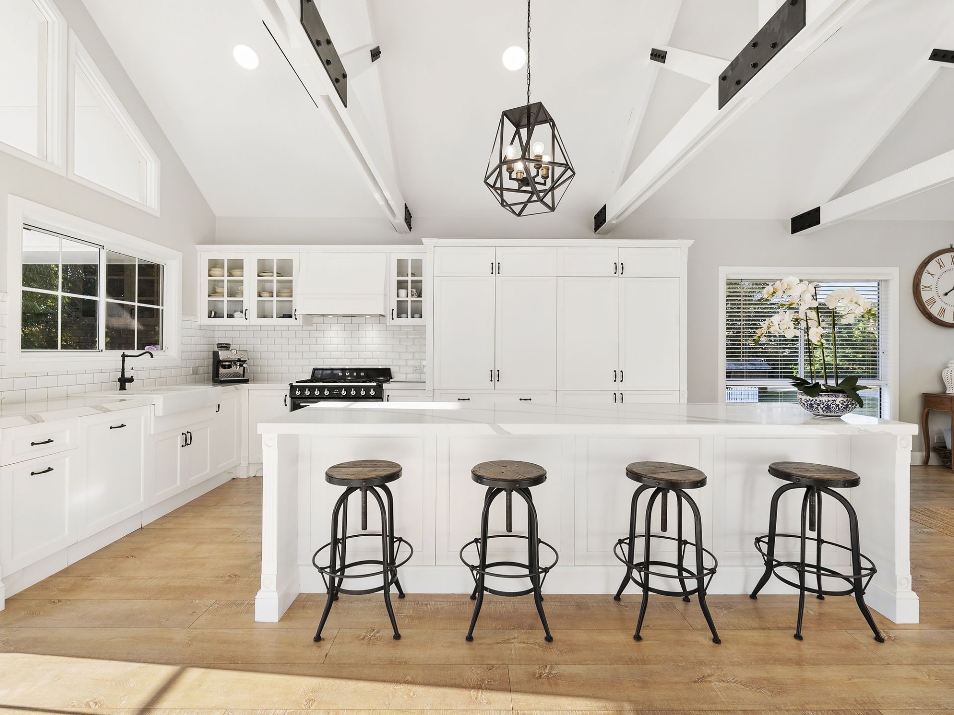 - Spacious Kitchen; featuring farmhouse sink, marble benchtops, Smeg oven/gas cooktop, and integrated fridge/freezer