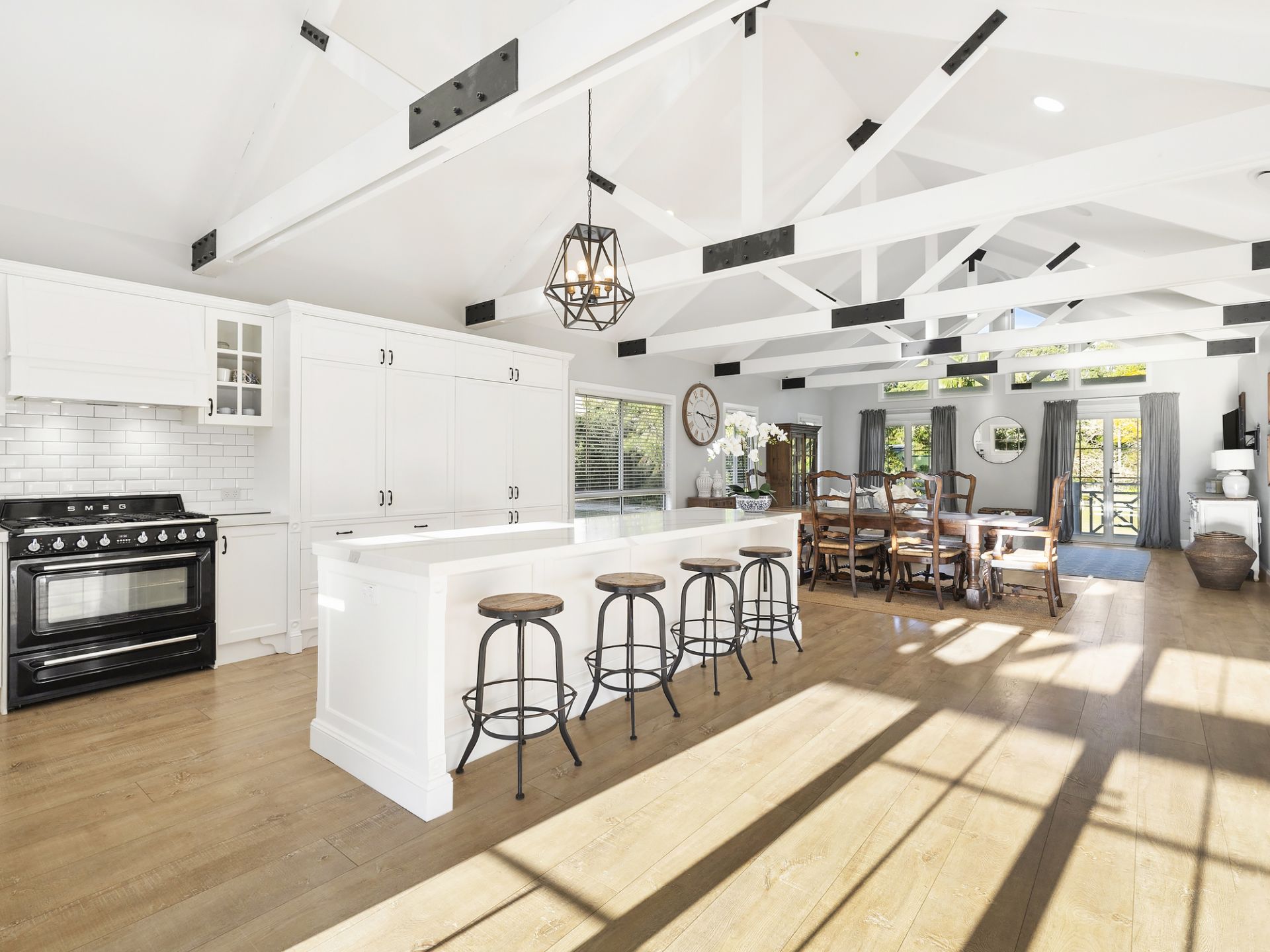 To one side sits the beautiful designer kitchen, featuring shaker-style cabinetry with contrast black hardware, Smeg oven/gas-cooktop, a farmhouse sink, integrated fridge/freezer and marble bench-tops with a grand centre breakfast-bar island. Adjoining, the vast living and dining areas offer an abundance of space for the whole family, designed as much for everyday life as for big celebrations gathered with loved ones.