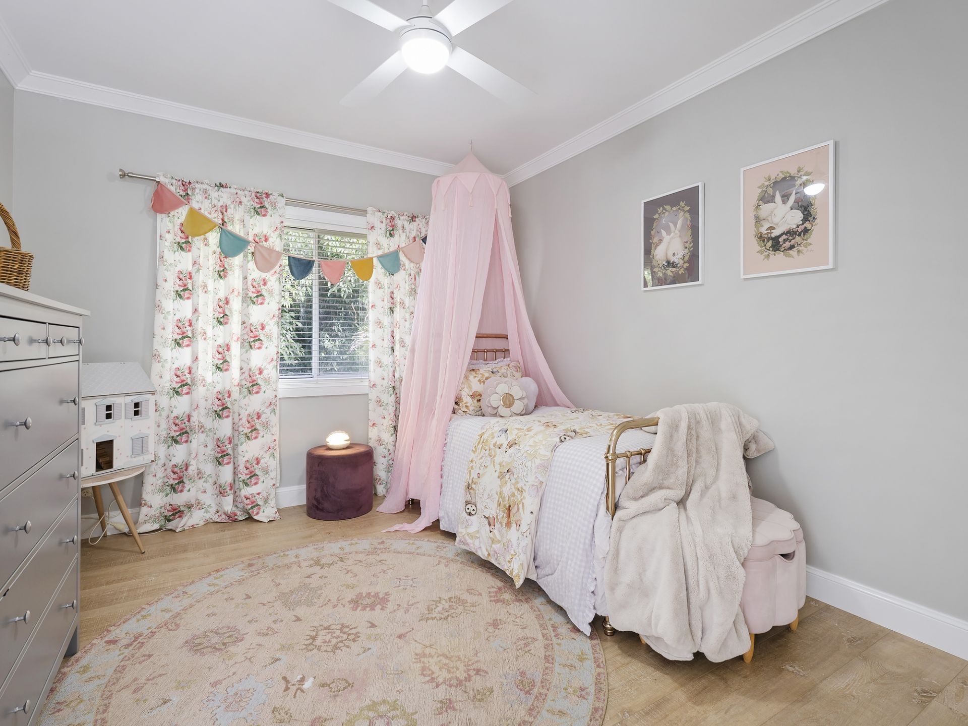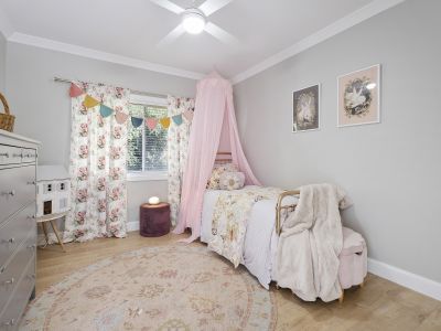 The master bedroom is a serene retreat, with a vaulted ceiling, plush bay window seat overlooking the backyard, walk-in robe, and luxe ensuite in timeless Hamptons style.
