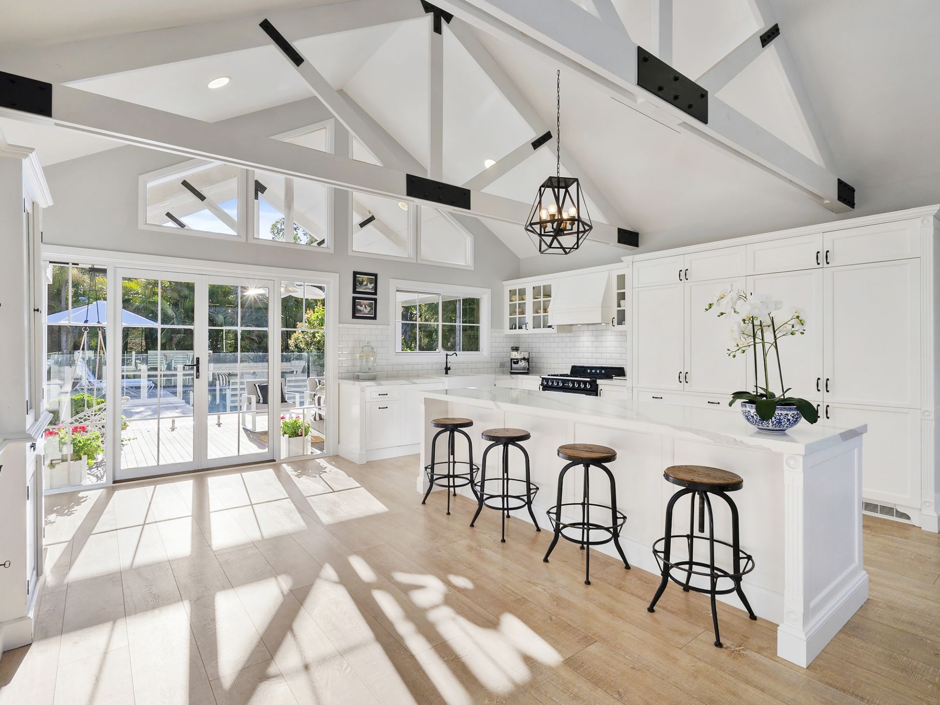 Step inside and light pours into a welcoming foyer, guiding you toward the soaring vaulted ceilings and exposed beams of the grand open-plan living area.