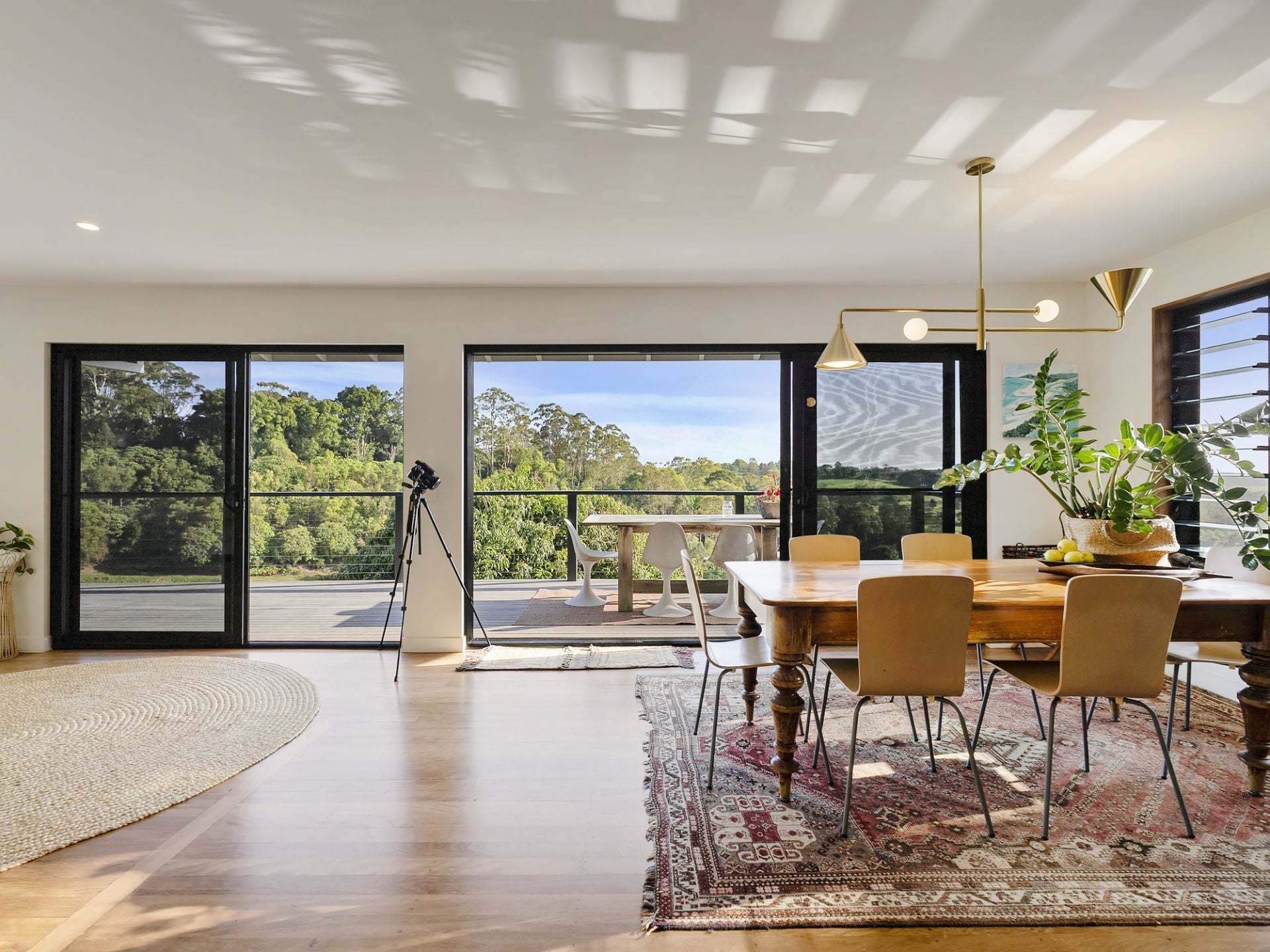- Open plan living, kitchen, dining area with large sliding doors leading out to a spacious deck that enjoys sweeping hinterland and ocean views