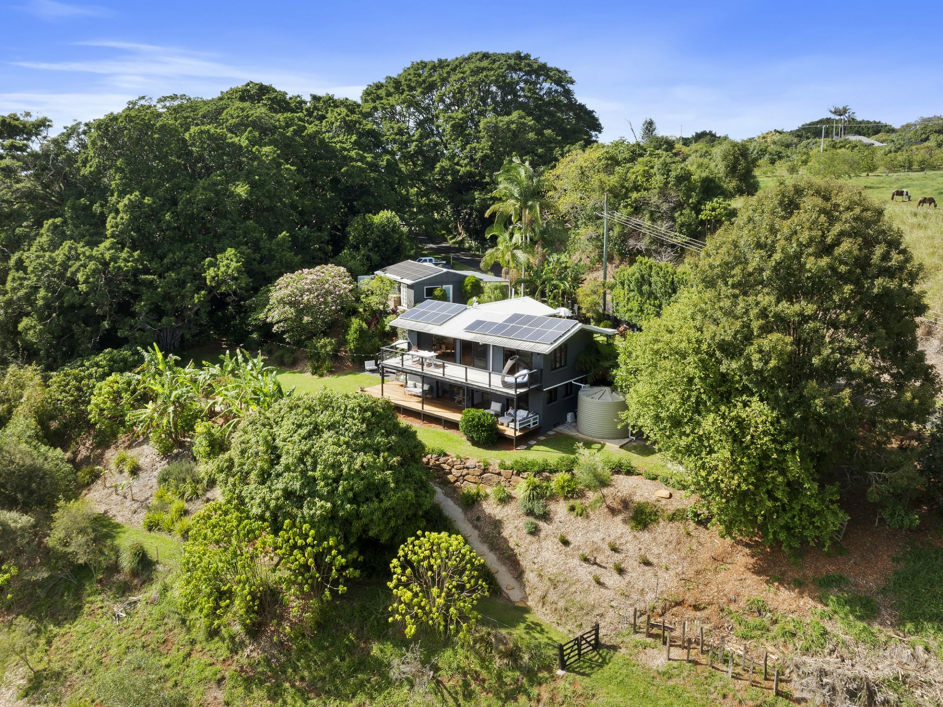 Outdoors, the property is every bit as nurturing and abundant. Walking trails weave through the landscape, leading to a spring-fed dam, creeks and a wetland area alive with native birdlife. A variety of mature fruit trees (mango, avocado, macadamia, lychee, banana, jackfruit, and citrus) add to the sense of living from the land. Enjoy summer days by the swimming pool, or tend to the irrigated garden beds serviced by extensive water storage, including a 22,550L polypropylene tank and an additional 5,000L steel tank.