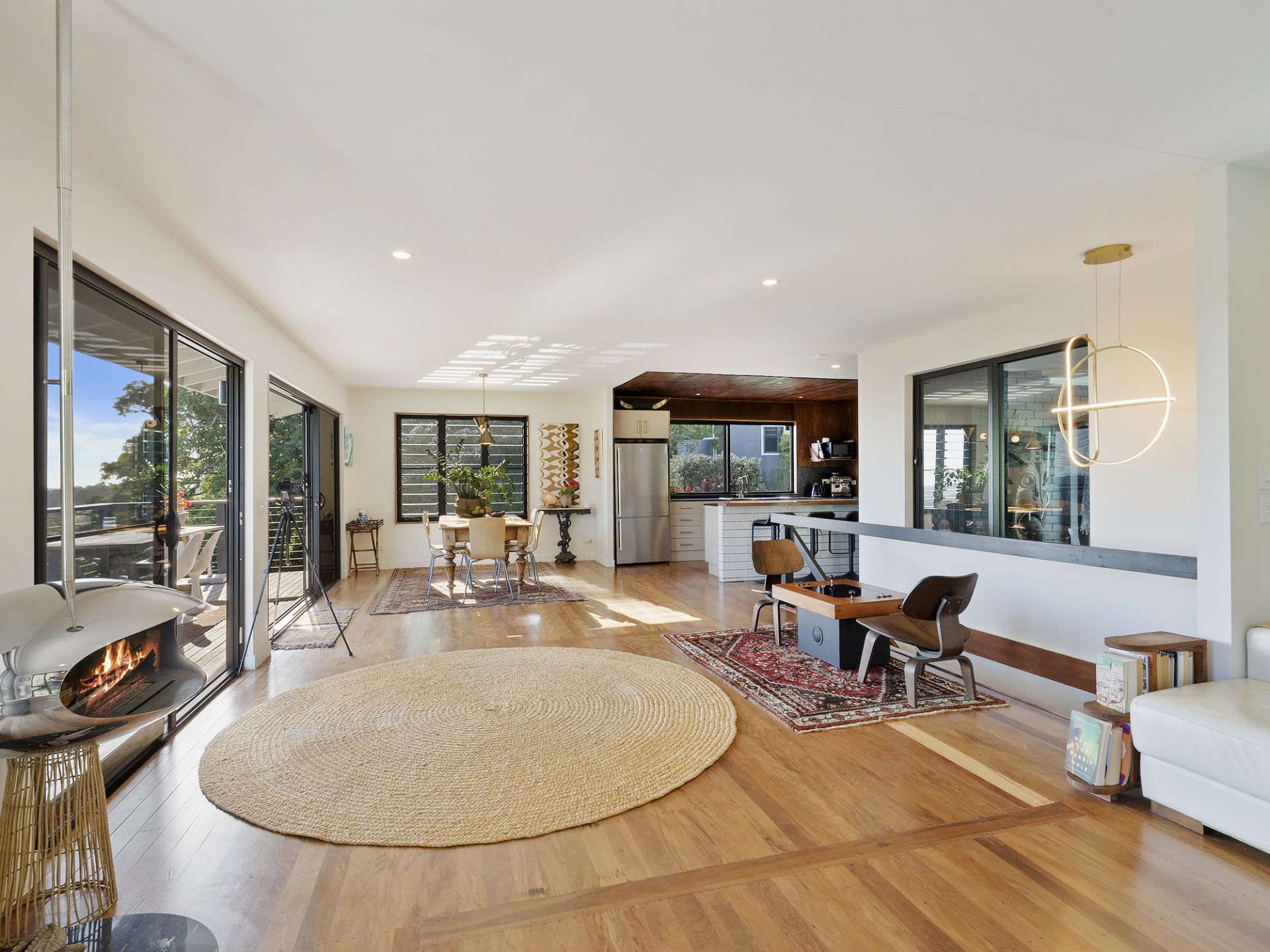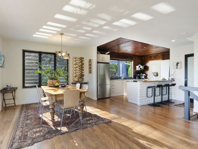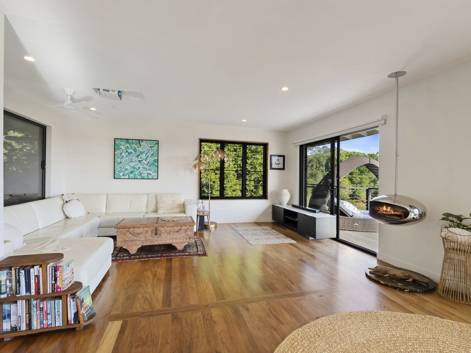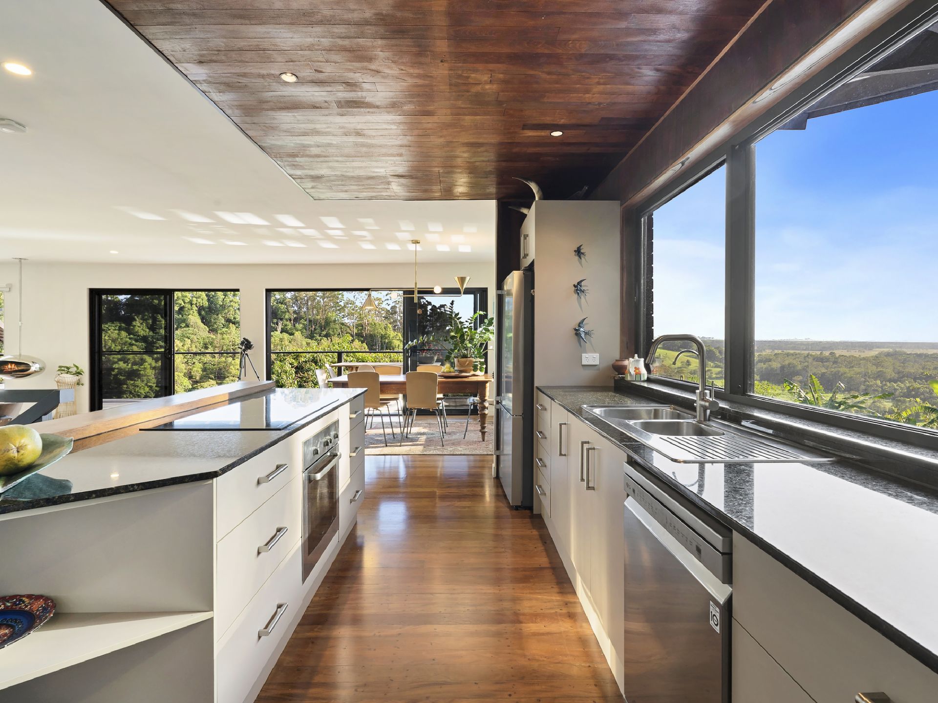 The main home is warm, inviting, and beautifully oriented to soak in the landscape. The heart of the home is the open-plan living, kitchen and dining area, where large sliding doors spill out onto a generous entertainer's deck. From here, sweeping hinterland and ocean views create a breathtaking backdrop-perfect for hosting family gatherings or simply unwinding beside the mid-century hanging fireplace as evening settles in.