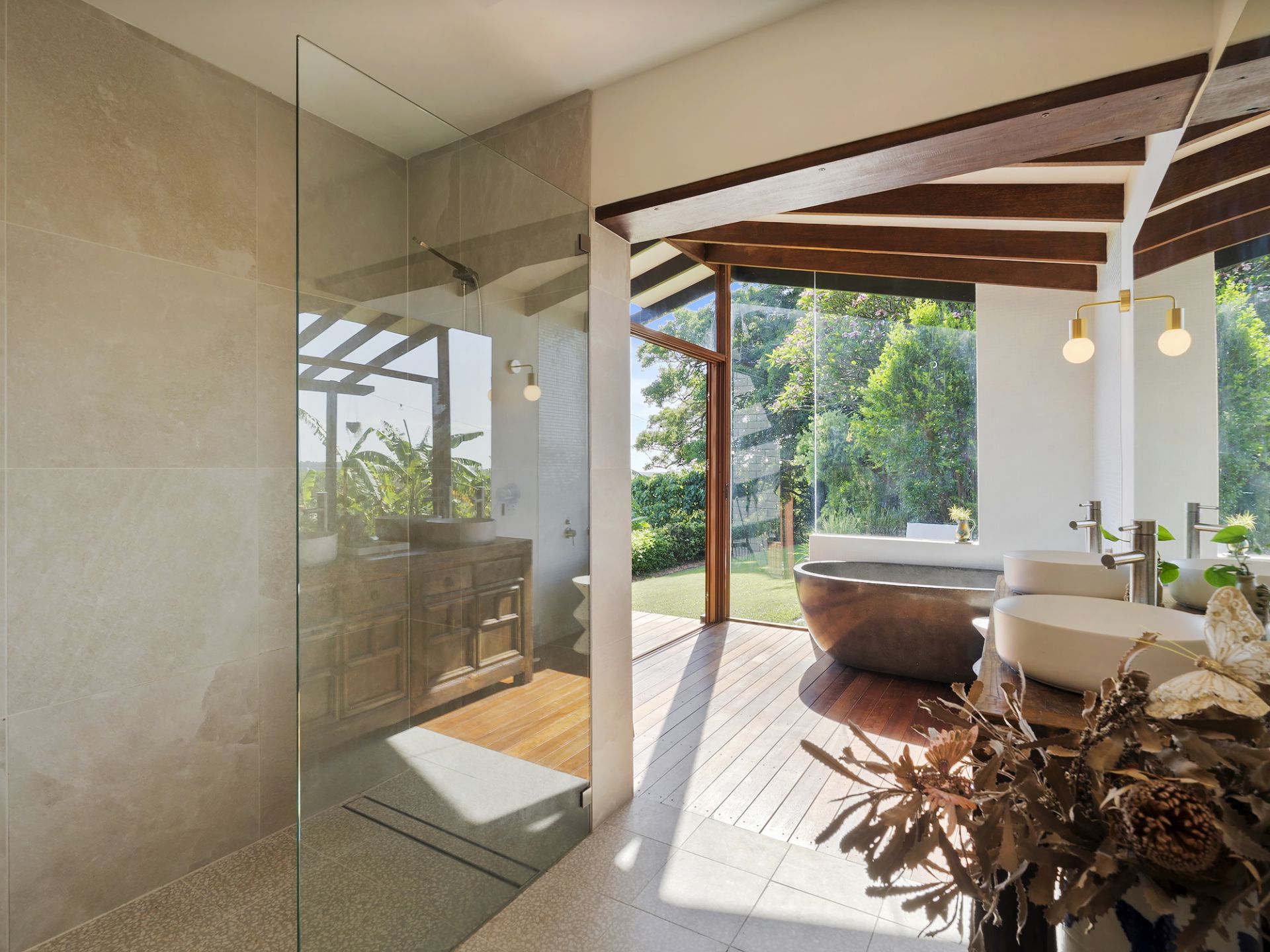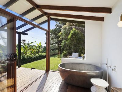 Downstairs, each of the three bedrooms enjoys lush green views and direct access to a wide ground-floor verandah; an idyllic spot for slow mornings with a coffee, listening to birdsong and watching the light shift across the valley. The family bathroom is a standout retreat: filled with natural light from floor-to-ceiling corner windows, it blurs the boundary between indoors and out, equipped with a dual-sink vanity, walk-in shower, and free-standing concrete bath that invites long, restorative soaks.
