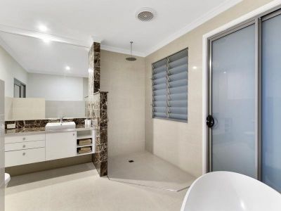 The garage boasts high ceilings and as seen on the floor plan attached, a very generous work space too. The garden has been landscaped for a busy family wanting a low maintenance space with different zones for play, animals or perhaps a veggie patch. The home overlooks the pool with a fabulous covered outdoor living/dining area that the current family spend most of their time in.
