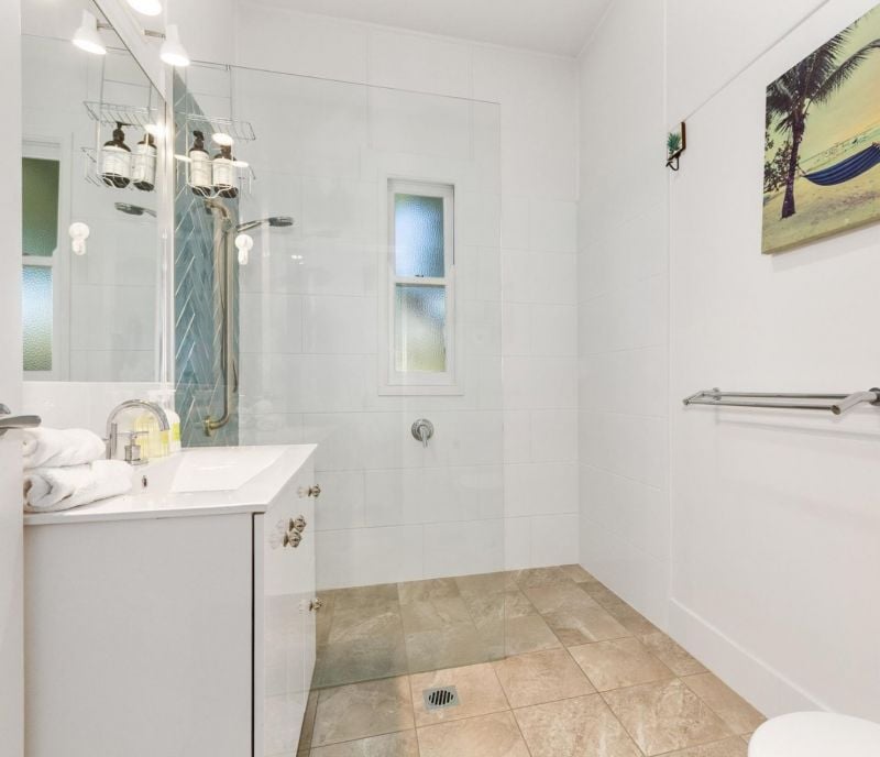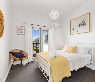 The refreshed coastal cottage offers three bedrooms and a central family bathroom. Inside, high ceilings and open-plan living create a light-filled and inviting atmosphere, perfect for relaxed beachside living.