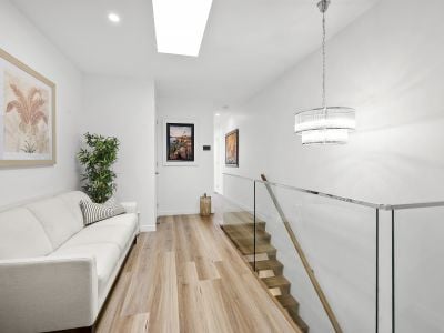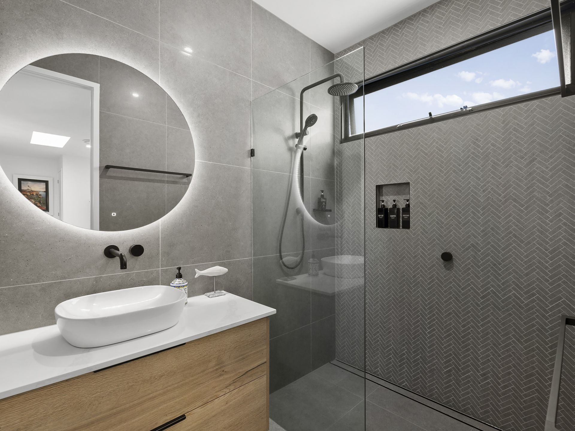 Ascend the Tasmanian Oak staircase to the cleverly designed mezzanine space - offering a perfect reading nook, second lounge, or work-from-home zone - with warm hybrid timber floors flowing throughout the upstairs area. The master suite includes a generous walk-in robe and sleek ensuite with floor-to-ceiling tiles, LED mirrors, frameless glass double shower, and stone-top vanity. The two additional bedrooms are generously sized and enjoy cooling breezes with the soothing sound of the nearby ocean, and the family bathroom with separate toilet ensure functionality and flexibility for modern living.