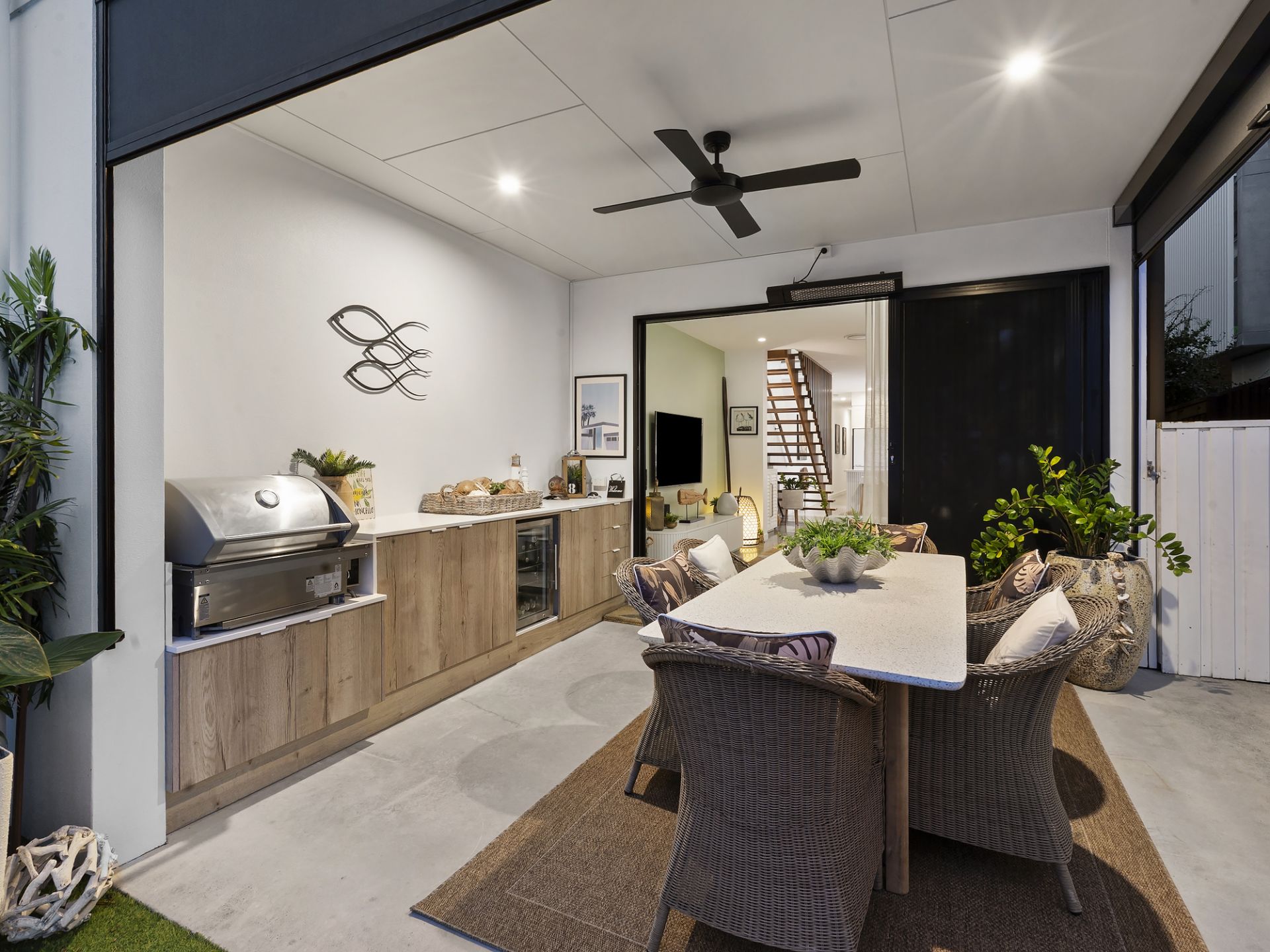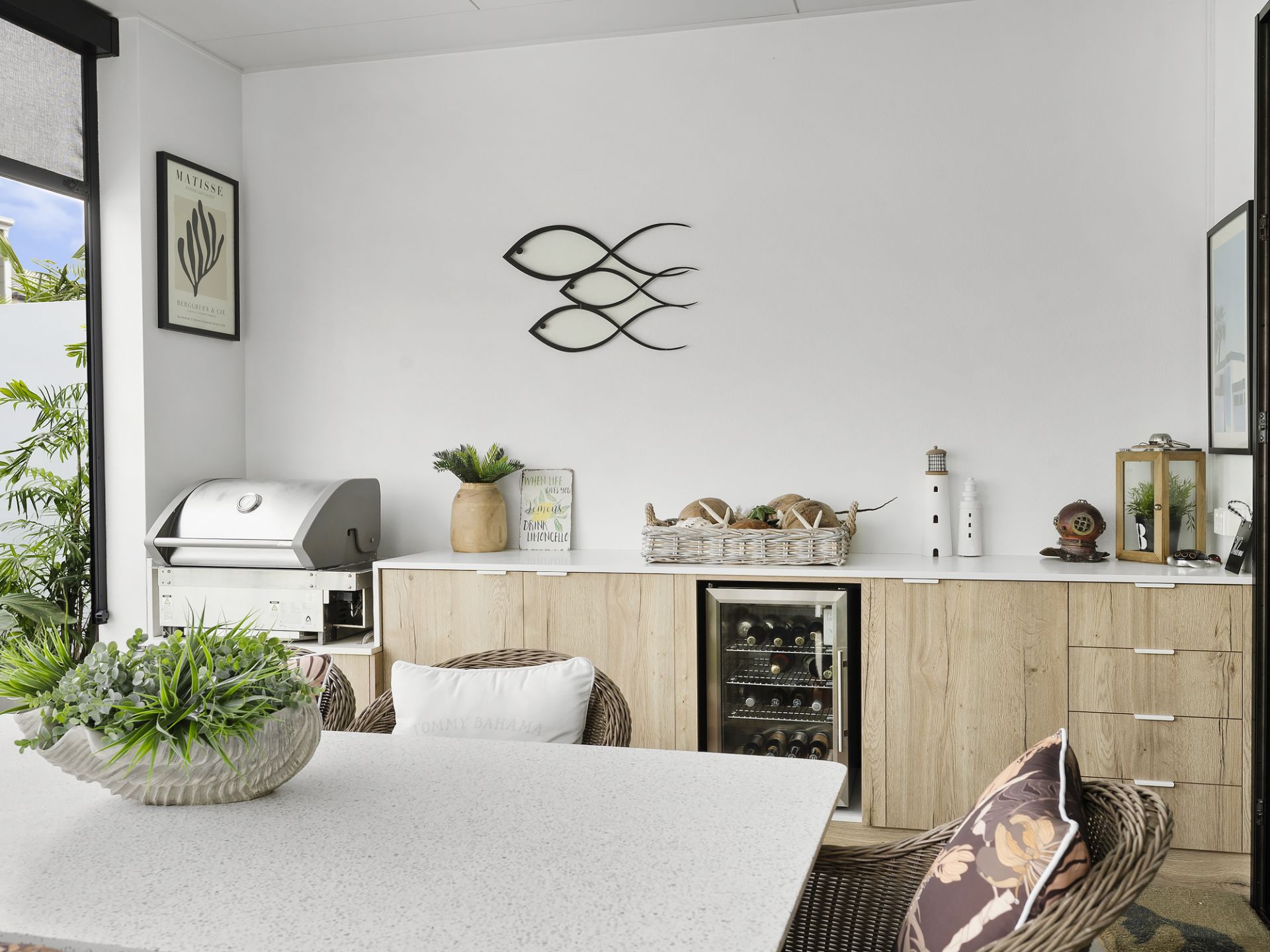- Alfresco area complete with ceiling fan, BBQ kitchenette, wine fridge, stone benchtop and in-built roller screen