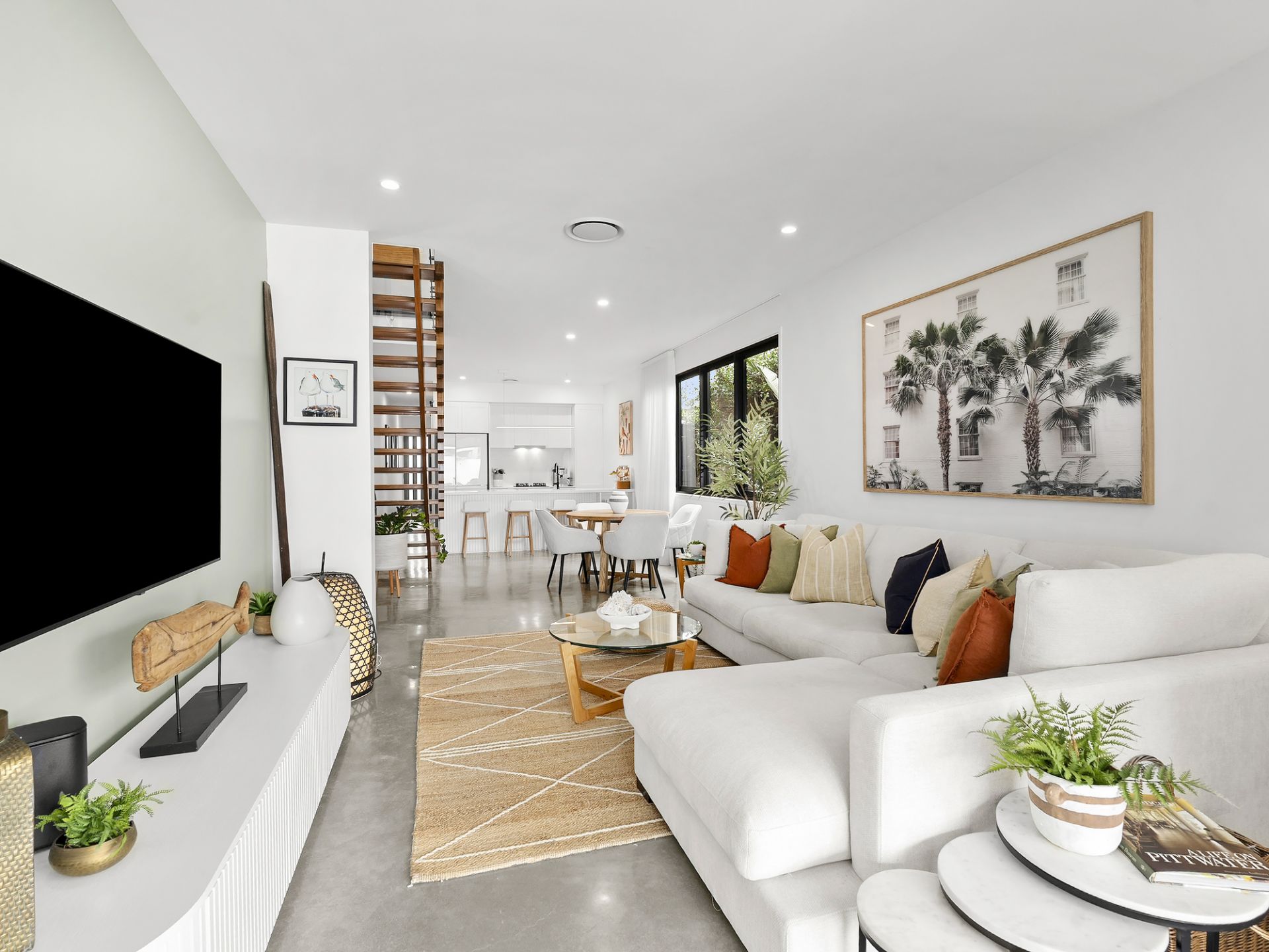Step inside and be welcomed by soaring 3-metre ceilings and polished concrete floors that flow throughout the open-plan ground level. The recently refreshed kitchen is a sleek and stylish hub, complete with Bosch appliances, a gas cooktop, stone bench-tops, ample storage, and soft coastal cabinetry. The living and dining area is filled with natural light and seamlessly connects to an outdoor retreat via large glass sliders.