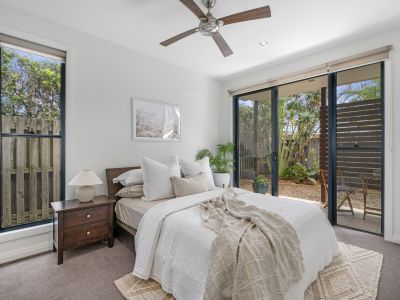The easy-care coastal haven you've longed for has arrived! Nestled across from the calm waters of Mooball Creek, and close to Pottsville Beach, this modern and airy villa delivers a blissful low-maintenance lifestyle. Spanning 212m2 over two levels, an expansive kitchen, lounge and dining area with high ceilings throughout seamlessly embraces indoor-outdoor living. Bifold doors connect this light-filled hub with the alfresco terrace, while a built-in study nook is a handy extra. Two bedrooms with built-in robes and a stylish main bathroom also grace this lower level, with upstairs dedicated to the sophisticated master suite. Crowned by a vaulted ceiling and complemented by a spa ensuite, walk-in robe, and a private balcony with creek vistas, it's your haven of relaxation.